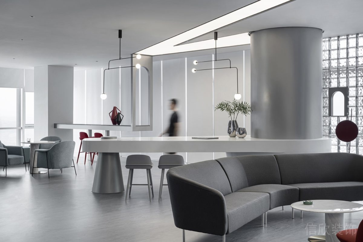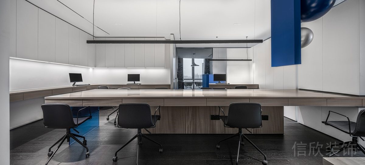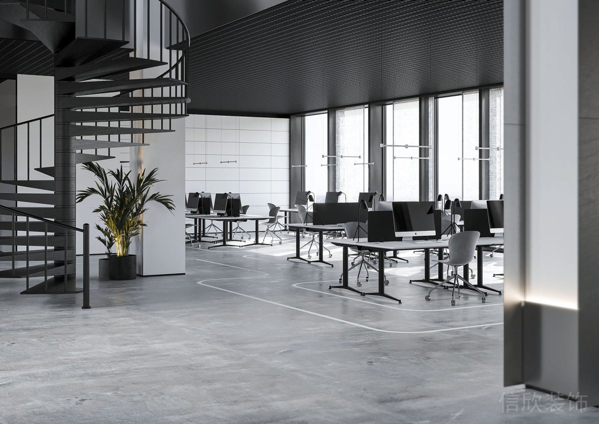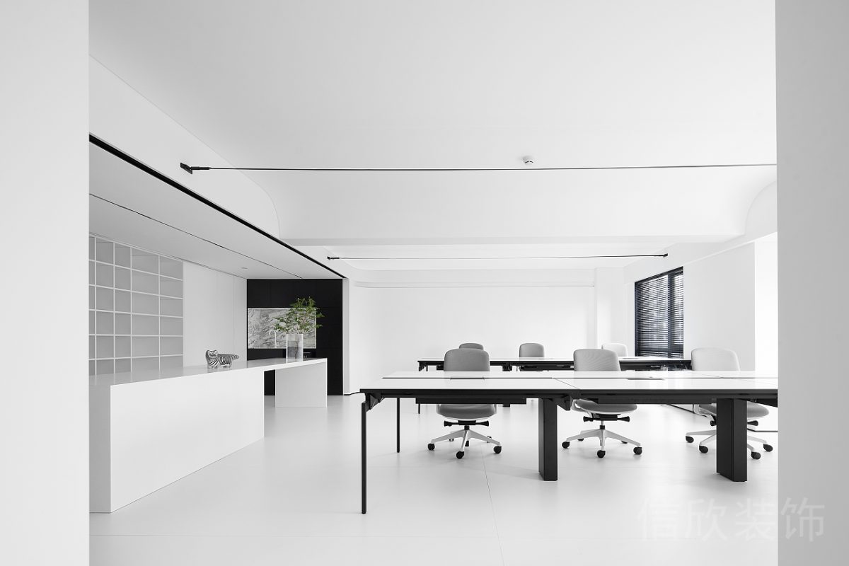黑白灰辦公室裝修設計,色彩多采用黑色、白色、灰色等無彩色。如深灰色地毯、白色辦公家私、淺灰色天花等搭配。整體裝修以簡約為主,多應用現代工業材料。打造靜謐的辦公環境,使人能保持冷靜的頭腦。適合于設計類、研發類辦公場所