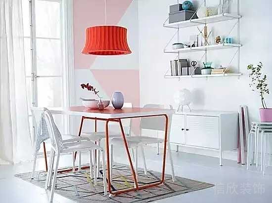 一款由木桌板和鐵藝支架構(gòu)成的餐桌,鮮艷的橘色搭配純凈的白色,時(shí)尚感十足。跳脫的幾何地毯、吊燈、餐桌在簡(jiǎn)單的空間里十分的亮眼。讓本來簡(jiǎn)單的裝修看起來有了層次感。