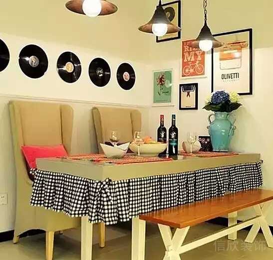 看到墻上的黑膠唱片的一瞬間是否有種時(shí)光流失的味道,好像回到了曾經(jīng)去過的街頭小吧,文藝范兒十足,具有年代感的裝飾畫,復(fù)古的金屬風(fēng)吊燈,還有曾經(jīng)聽過的唱片,如果能在這樣的地方吃飯聊天也是很溫馨的一件事。