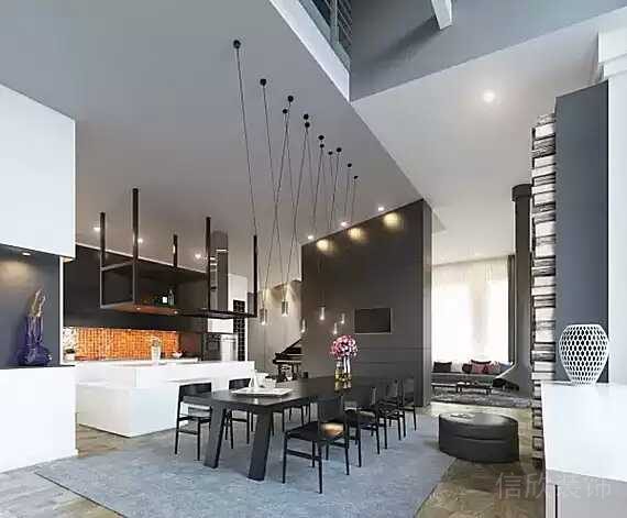 裝修豪華的大戶型總是少不了這樣的黑色餐桌,它與長(zhǎng)線的吊燈簡(jiǎn)直就是絕配。以如此緊湊的方式和黑暗的色調(diào)堆砌出來的廚房,黑色餐桌幾乎像一個(gè)鏡子,廚房高架給這個(gè)現(xiàn)代餐廳套上《愛麗絲夢(mèng)游仙境》的感覺。