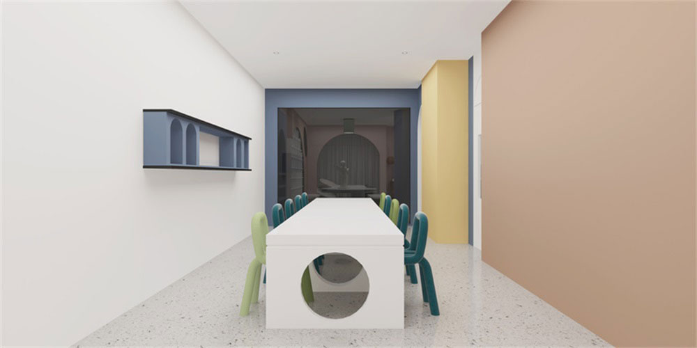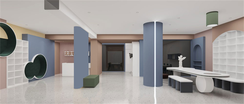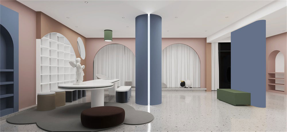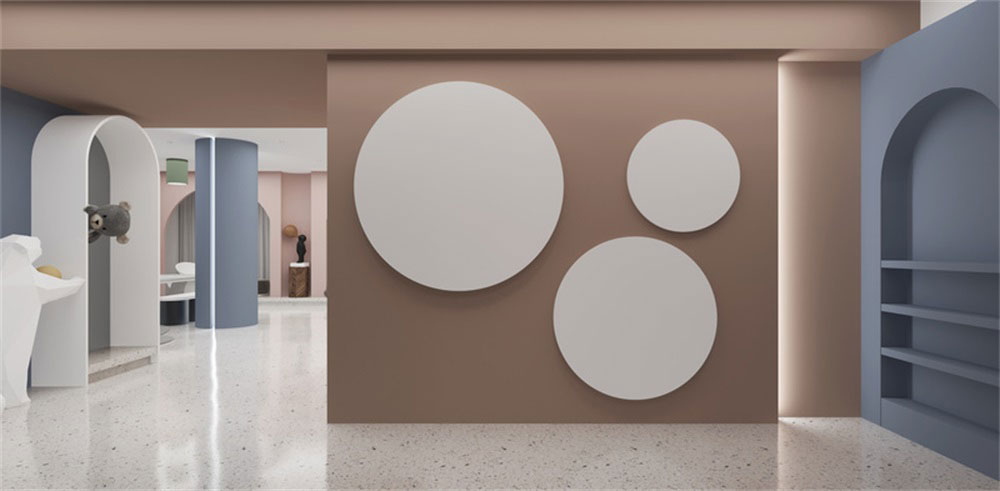前廳的設計上,采用了半圓形拱門式的設計,更偏重于卡通的感覺,整體色彩的應用簡單,通過朱紅色,藍色,白色的相互對比和襯托,讓整體感覺形象生動。