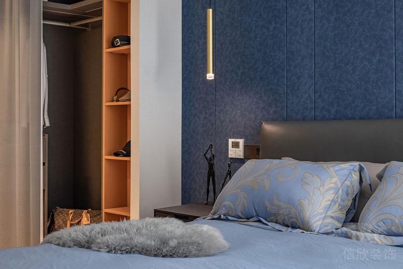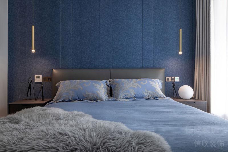 主臥室的設計采用了皮藝的床,和藍色斑點的硬包背景墻,配上代表輕奢風的金屬長管式吊燈,協調,溫馨中多了一份與眾不同的氣質。