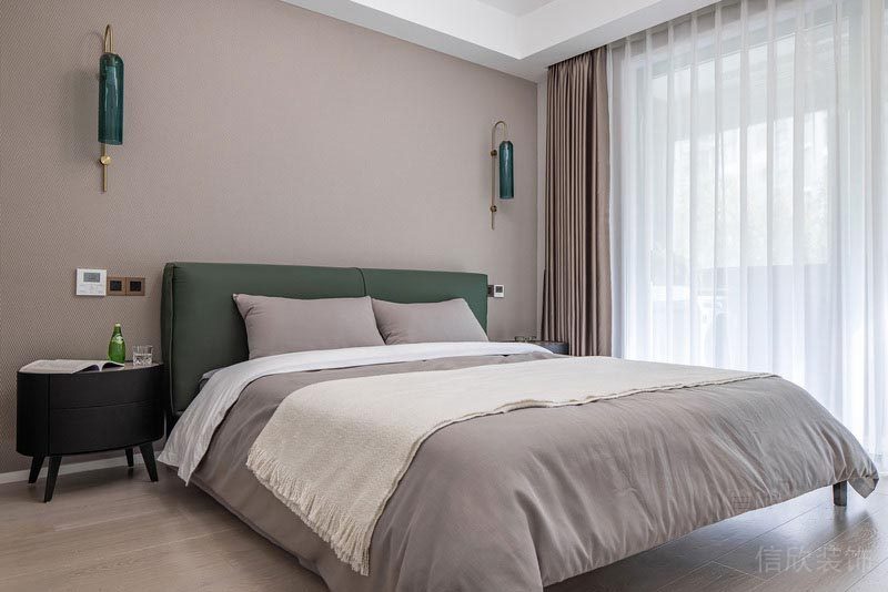 次臥室采用了一體式的白色衣柜和灰色寫字桌混搭,簡單的淺灰壁紙和米色的床頭背景墻壁紙相區分,適合的布藝床,體現出現代簡約風中,簡單,低調,實用性極強的特點。