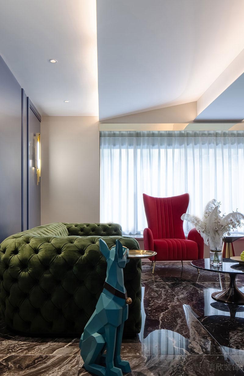 綠色沙發代表著希望,紅色的沙發椅則代表熱情,紅綠搭配的組合;讓人心曠神怡,背景墻藍色的高貴,金色壁燈的貴氣,烘托出整個客廳的浪漫氛圍。