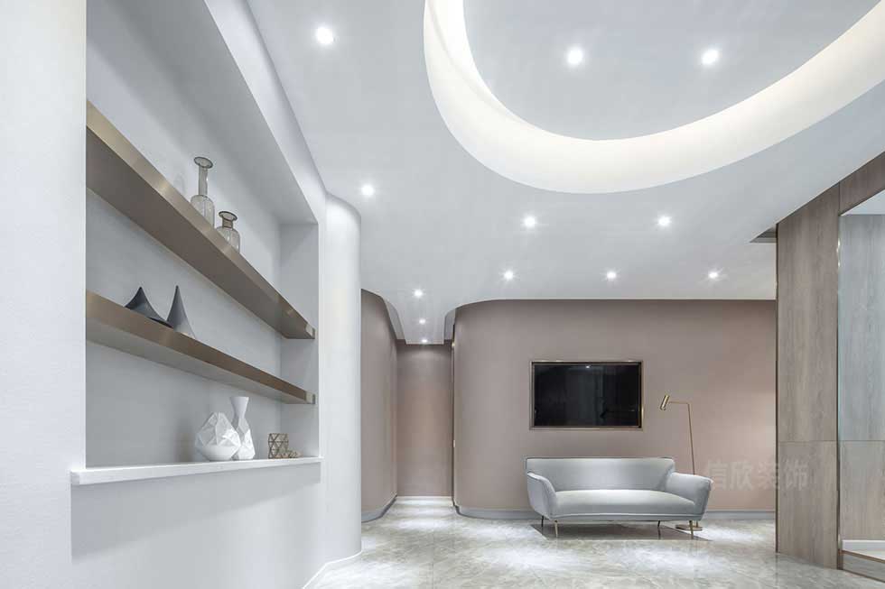 ▼除了木飾面,我們還大面積采用了皮紋墻紙,使極簡(jiǎn)的空間中透露出一絲的細(xì)膩與親切感,圓弧形的隔斷墻與裝飾讓空間更加包容、靈動(dòng)、流暢