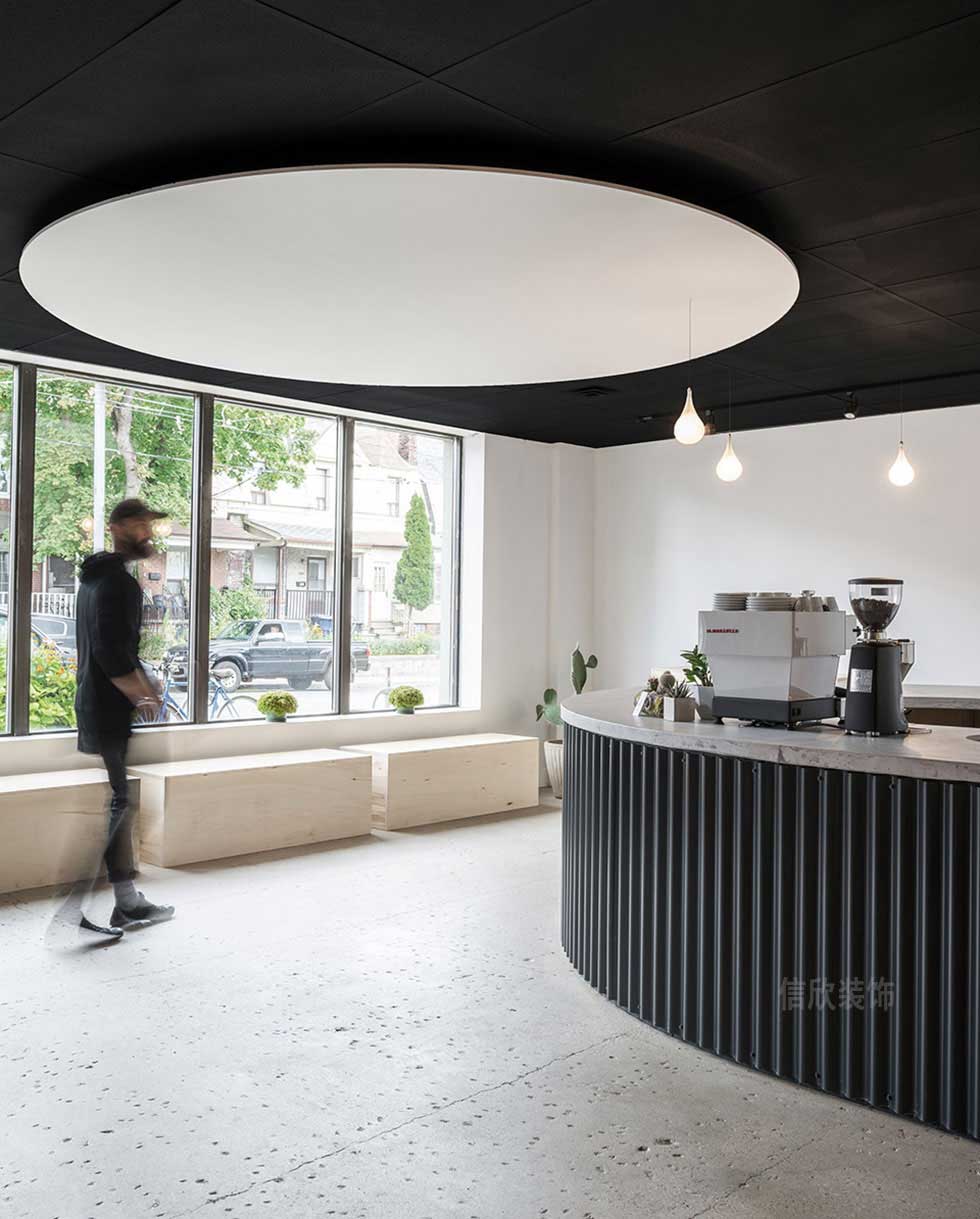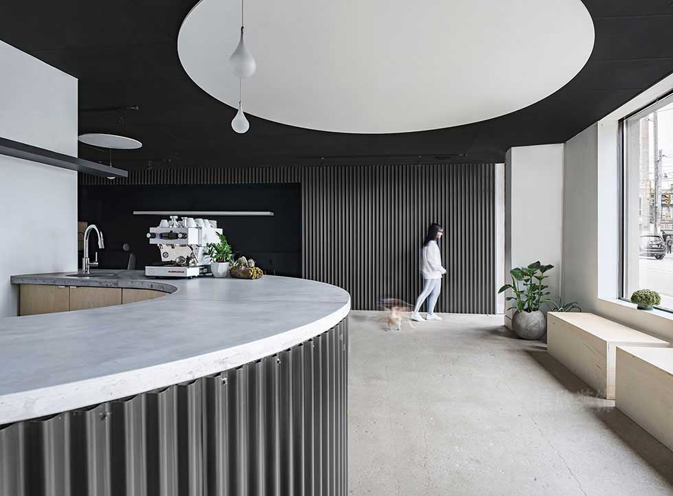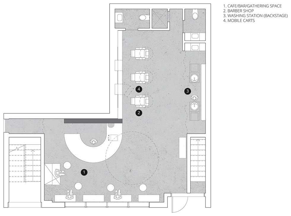 項目中最引人注目的部分是由弧形金屬波紋板和混凝土做成的吧臺,它幾乎占據了整個空間,側面可以用作理發師的工作臺。吧臺下方設有可以隨意移動的推車,理發椅也可以簡單地收納到洗發間中。模塊化的復合木板椅進一步加強了空間的靈活性,它們可以被移動組合以適應不同功能。