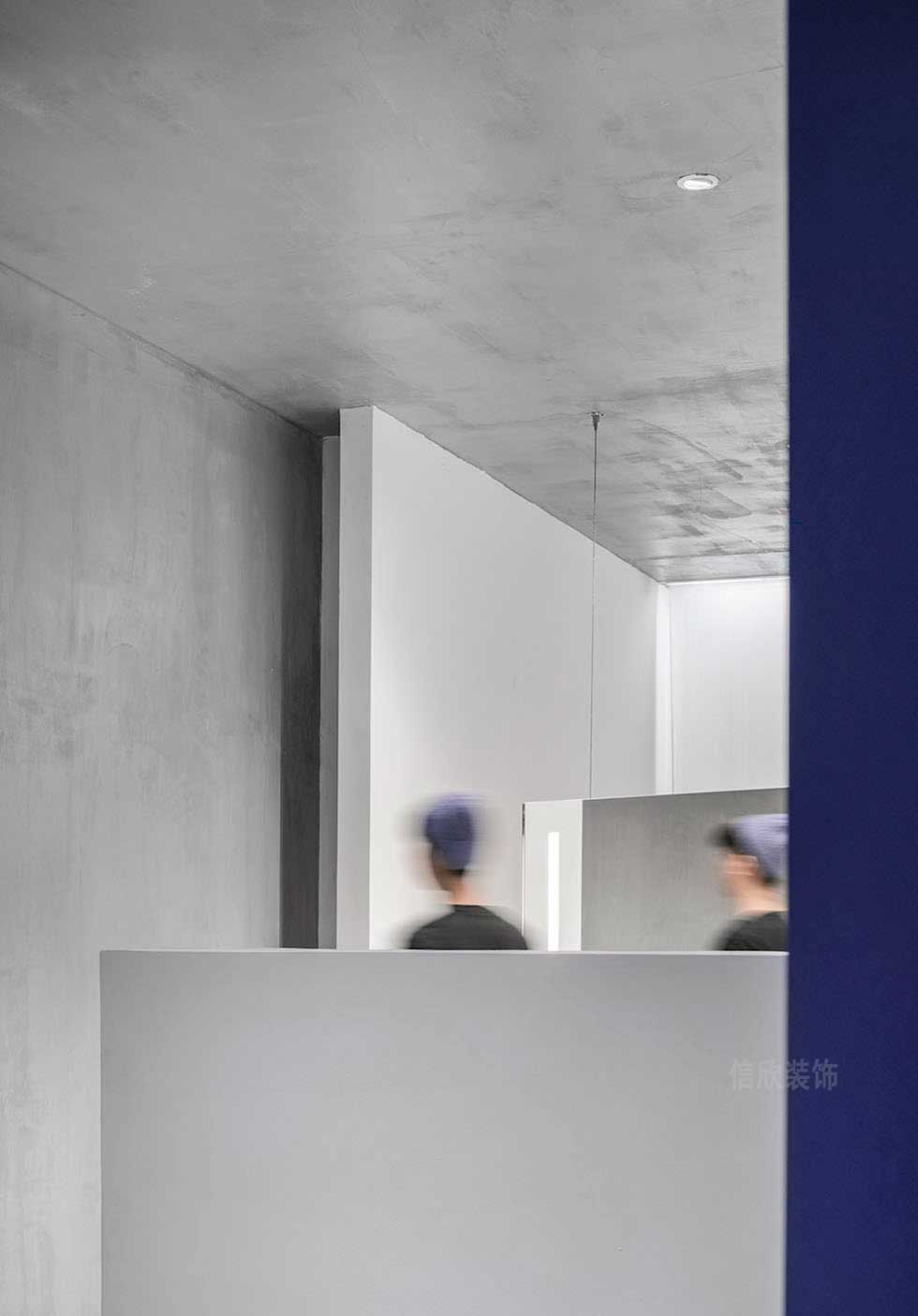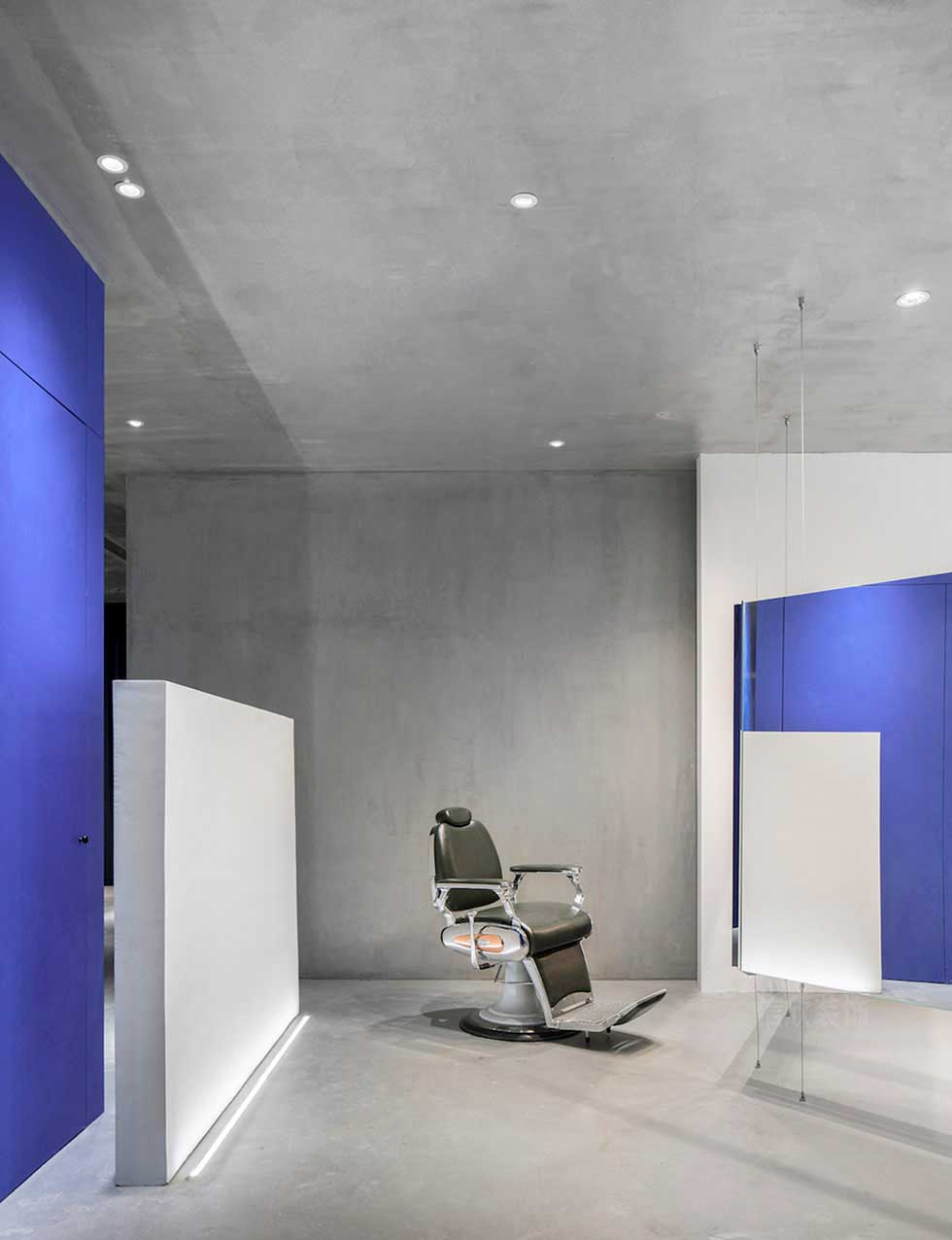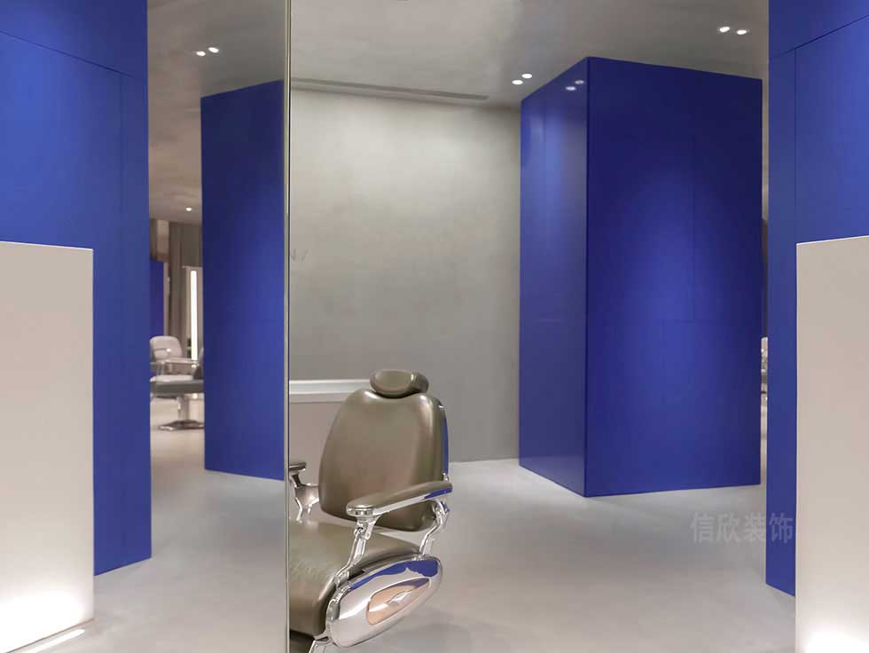 設(shè)計(jì)理念:這是一個(gè)在商場(chǎng)原安全通道基礎(chǔ)上改造的理發(fā)店。從設(shè)計(jì)到施工結(jié)束的周期大概一個(gè)月的時(shí)間,時(shí)間很短,限制很多,要求很多。不能有任何的固定隔墻,所有空間中可見的墻體都是臨時(shí)的必須可移動(dòng)的。包括吧臺(tái),鏡面,柜體都是可移動(dòng)的。在有限的面積里,需要滿足員工休息區(qū),洗頭區(qū),vip護(hù)理區(qū),雜物收納間,等待區(qū),不少于12個(gè)的理發(fā)位,和足夠的收納等等。設(shè)計(jì)以塊面的穿插,鏡面的反射來趣味整個(gè)空間,藍(lán)色作為對(duì)比和跳躍,在灰白的空間中去做出打破。