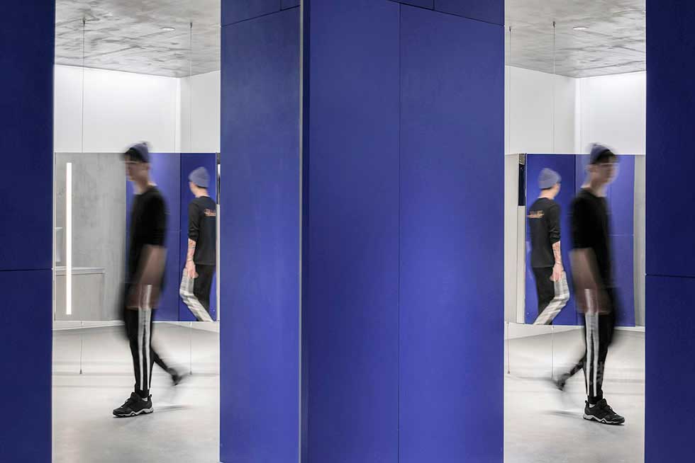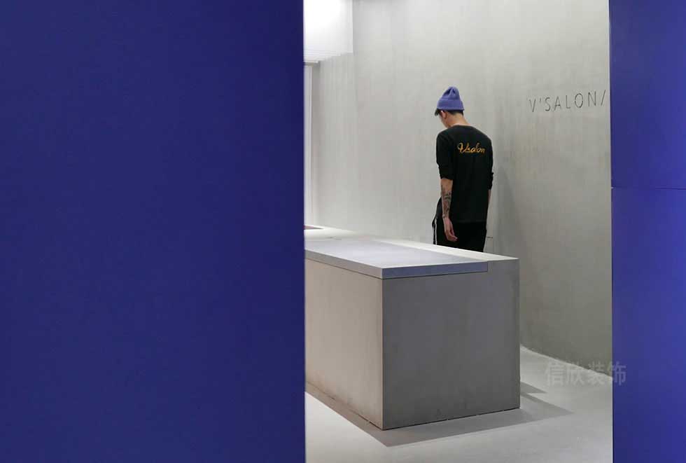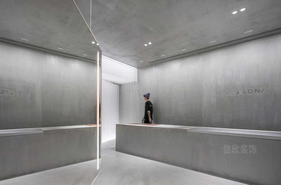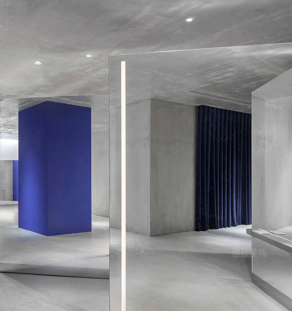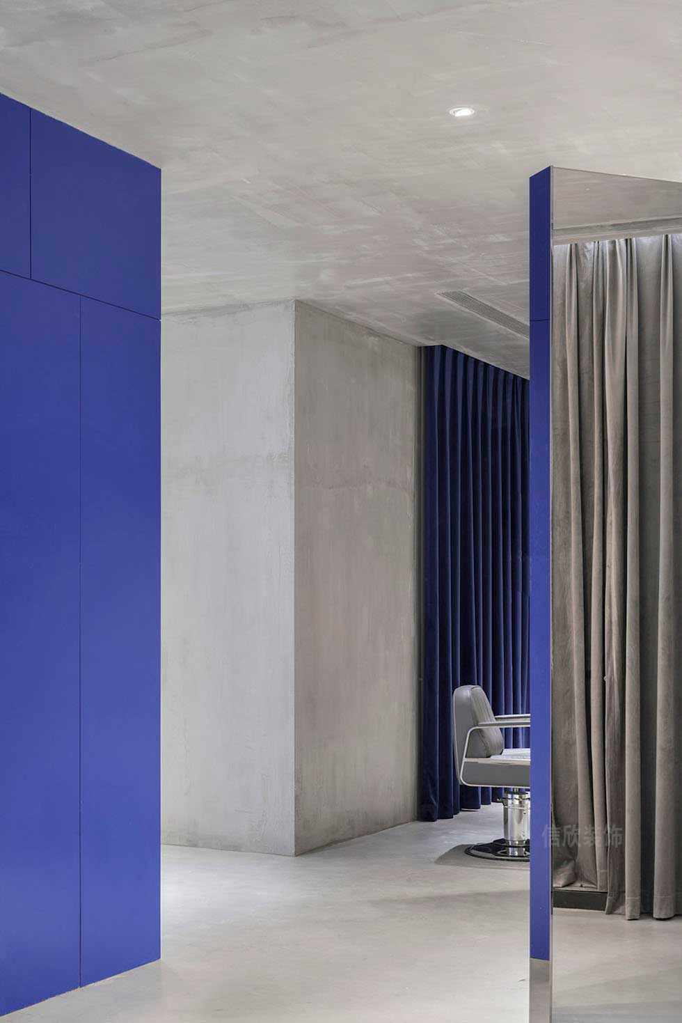 設(shè)計(jì)理念:這是一個(gè)在商場(chǎng)原安全通道基礎(chǔ)上改造的理發(fā)店。從設(shè)計(jì)到施工結(jié)束的周期大概一個(gè)月的時(shí)間,時(shí)間很短,限制很多,要求很多。不能有任何的固定隔墻,所有空間中可見的墻體都是臨時(shí)的必須可移動(dòng)的。包括吧臺(tái),鏡面,柜體都是可移動(dòng)的。在有限的面積里,需要滿足員工休息區(qū),洗頭區(qū),vip護(hù)理區(qū),雜物收納間,等待區(qū),不少于12個(gè)的理發(fā)位,和足夠的收納等等。設(shè)計(jì)以塊面的穿插,鏡面的反射來趣味整個(gè)空間,藍(lán)色作為對(duì)比和跳躍,在灰白的空間中去做出打破。