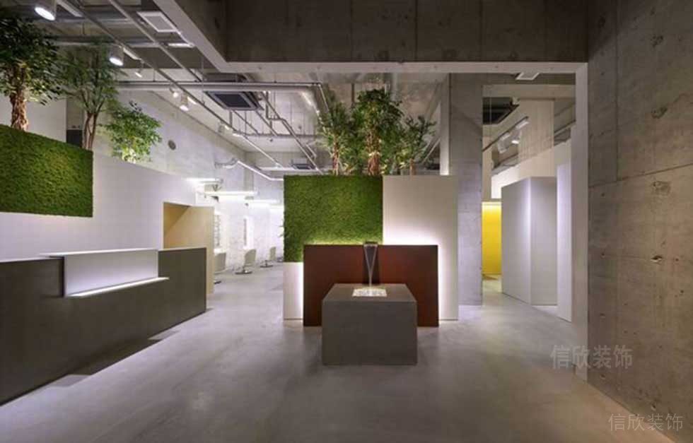 灰色的水泥前臺,白色和綠植結合的背景墻,頂面露出的水管不做多余的處理,仿佛經過了歲月的積累,工業風的車間爬滿了綠植一般,注重的是體驗感和心靈的升華。