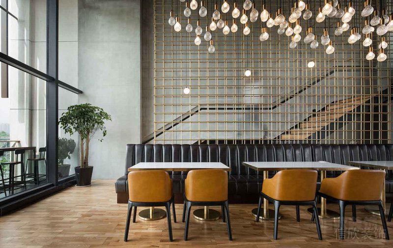大量簡約工業(yè)元素的應用,精致的工業(yè)吊燈,鐵藝的隔墻,酒瓶做成的背景墻,打造出的簡潔,明快,深入人心的主題;讓客人進入就有眼前的一亮的潮流感。