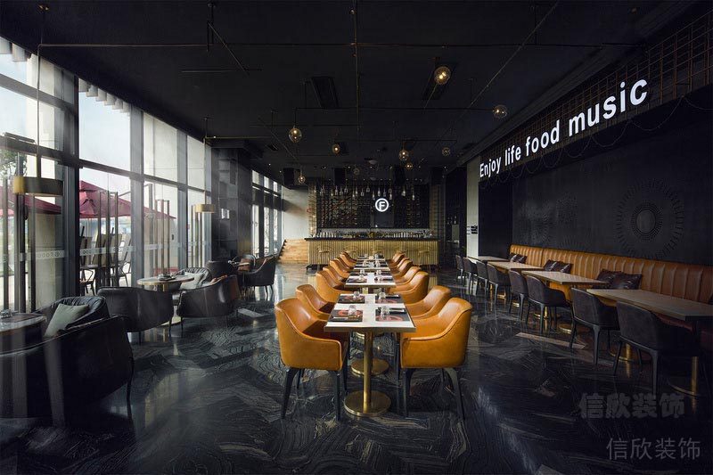 質(zhì)感水泥打造出的灰墻,紋理凸出,線條優(yōu)美,配上黑色的桌椅,一股屬于冷色調(diào)的優(yōu)雅