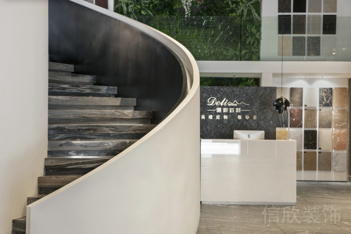 將回型頂天花板與大理石桌板前臺結(jié)合,能夠創(chuàng)建一個視覺上引人注目且充滿現(xiàn)代感的空間。