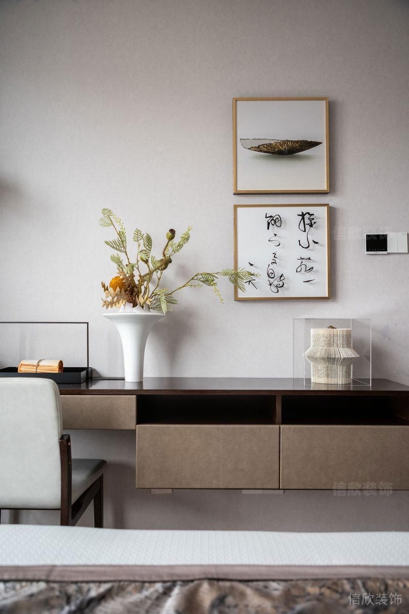 富有中式情調的背景墻,考究的新中式家具,顯示出古老中國元素和現代時尚相融合的另一番簡潔的精美,書桌代替背景墻,是主人文化底蘊的體現。
