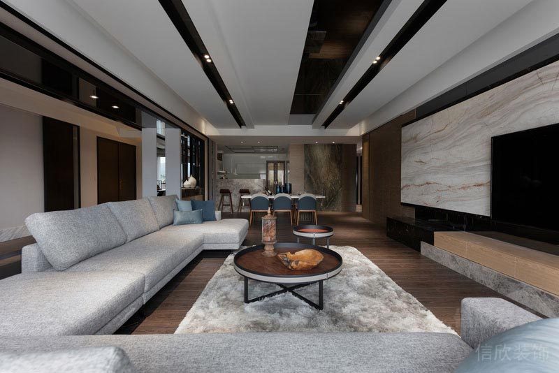 深圳市龍華區北宸之光家園客廳 深色木紋大面積的客廳木地板,增加了客廳的厚重感和深沉味道,白色帶黑色反光玻璃的吊頂;讓黑與白的搭配漂亮而時尚,深色木紋和天然大理石的電視背景墻,體現了自然的美和簡單的奢華。