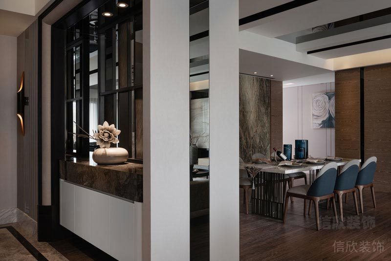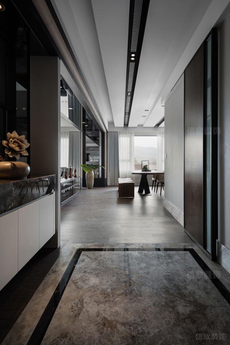 深圳市龍華區北宸之光家園入戶 黑色金屬感玄關背景,懸空式白色柜體石材紋理的玄關柜,把黑白搭配的高雅和奪目體現出來,起到了先聲奪人,拋磚引玉的效果,灰色地磚地面,更是和客廳的木地板做了一個完美的區域分割。