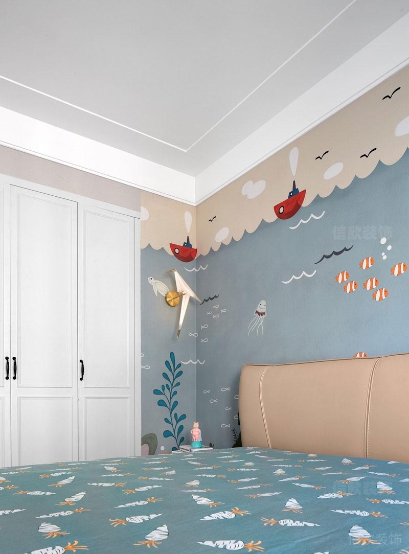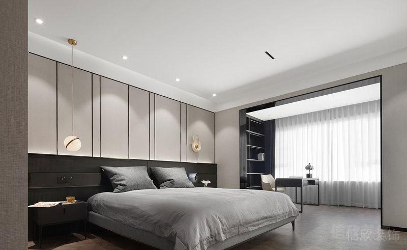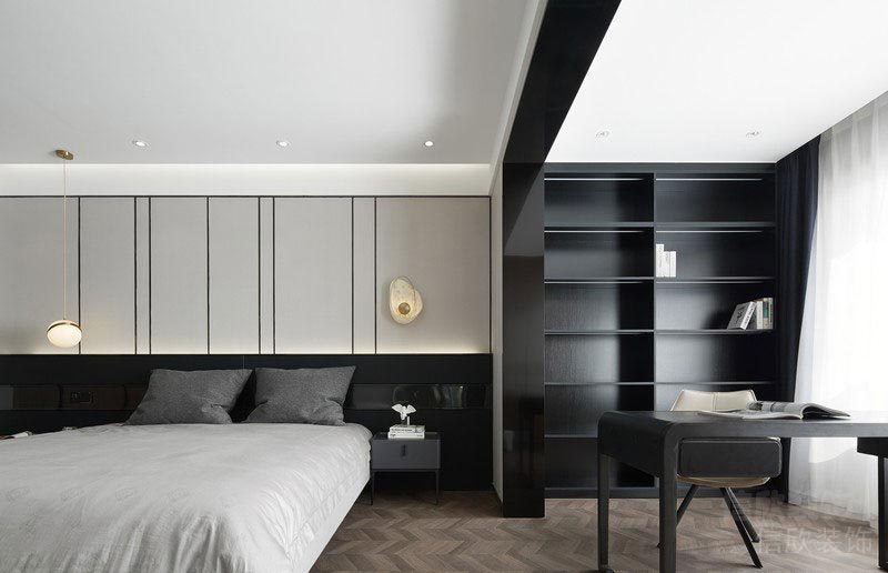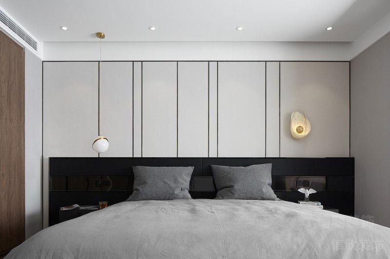 平頂懸浮與進(jìn)口射燈代替?zhèn)鹘y(tǒng)吊頂與吊燈, 床頭保持統(tǒng)一性與結(jié)構(gòu)美, 內(nèi)置交叉手工編織皮質(zhì)包裹, 搭配不對稱設(shè)計(jì)燈飾, 既能體現(xiàn)空間的整體連貫,又打破呆板。