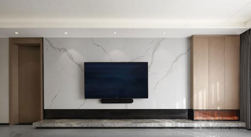 影視墻儲(chǔ)物柜與左側(cè)房門顏色統(tǒng)一對稱, 儲(chǔ)物柜下增設(shè)壁爐調(diào)節(jié)墻面層次。 細(xì)節(jié)處藏納乾坤, 溫暖和煦于雅致間層現(xiàn)。