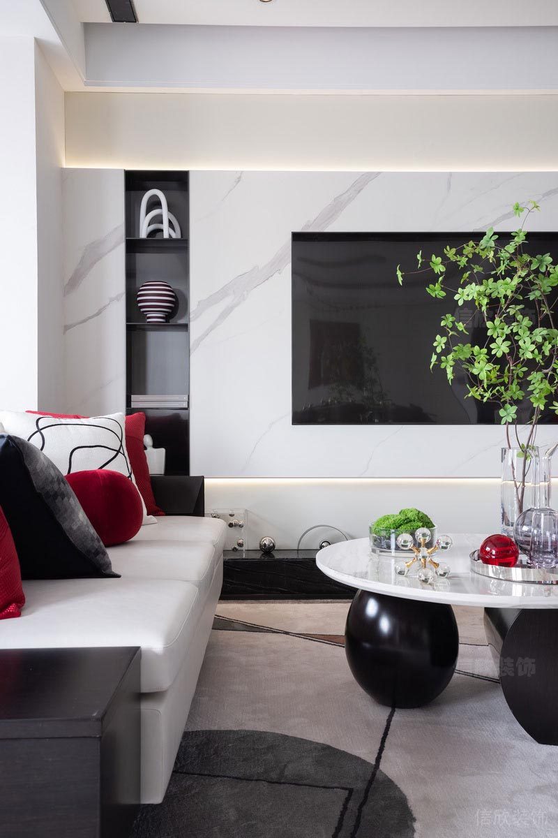 深圳龍華區民治龍光玖鉆客廳 白色石紋背景墻,黑白色調的沙發,簡潔而不平凡的氣質,盡顯奢華的格調。