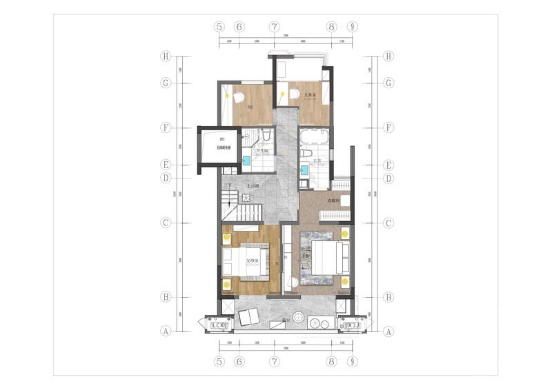 深圳龍華區民治龍光玖鉆兒童房 情趣感十足的兒童房,卡通藝術墻面,搭配置物柜,童趣倍增。