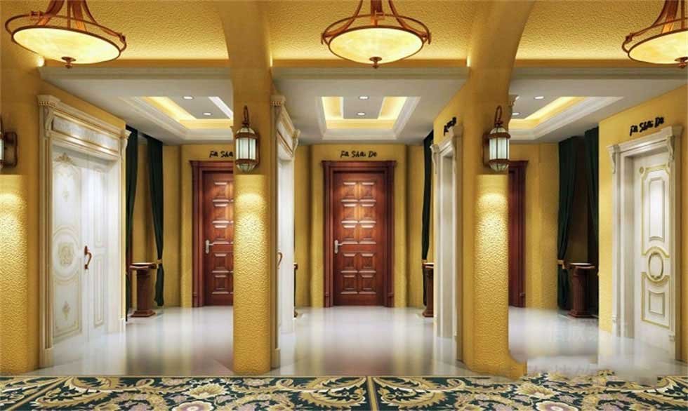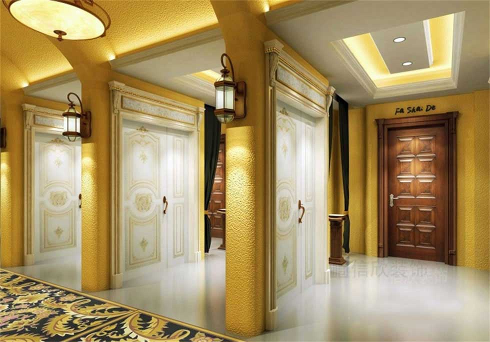 天然石材作為外墻的包裹,顯得很有歲月的沖刷感和歷史的文化沉淀,亮眼的黃色主色調,在外面就能看到一道道歐式宮廷般的實木門,沉重而大氣。