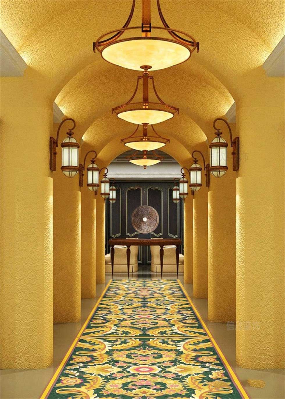 一道道拱形的小門,砂礫感涂料制成的墻面,在吊燈和壁燈的裝點下,顯得非常有漫步在歐洲古典城堡中,獨特的復古韻味和內涵。