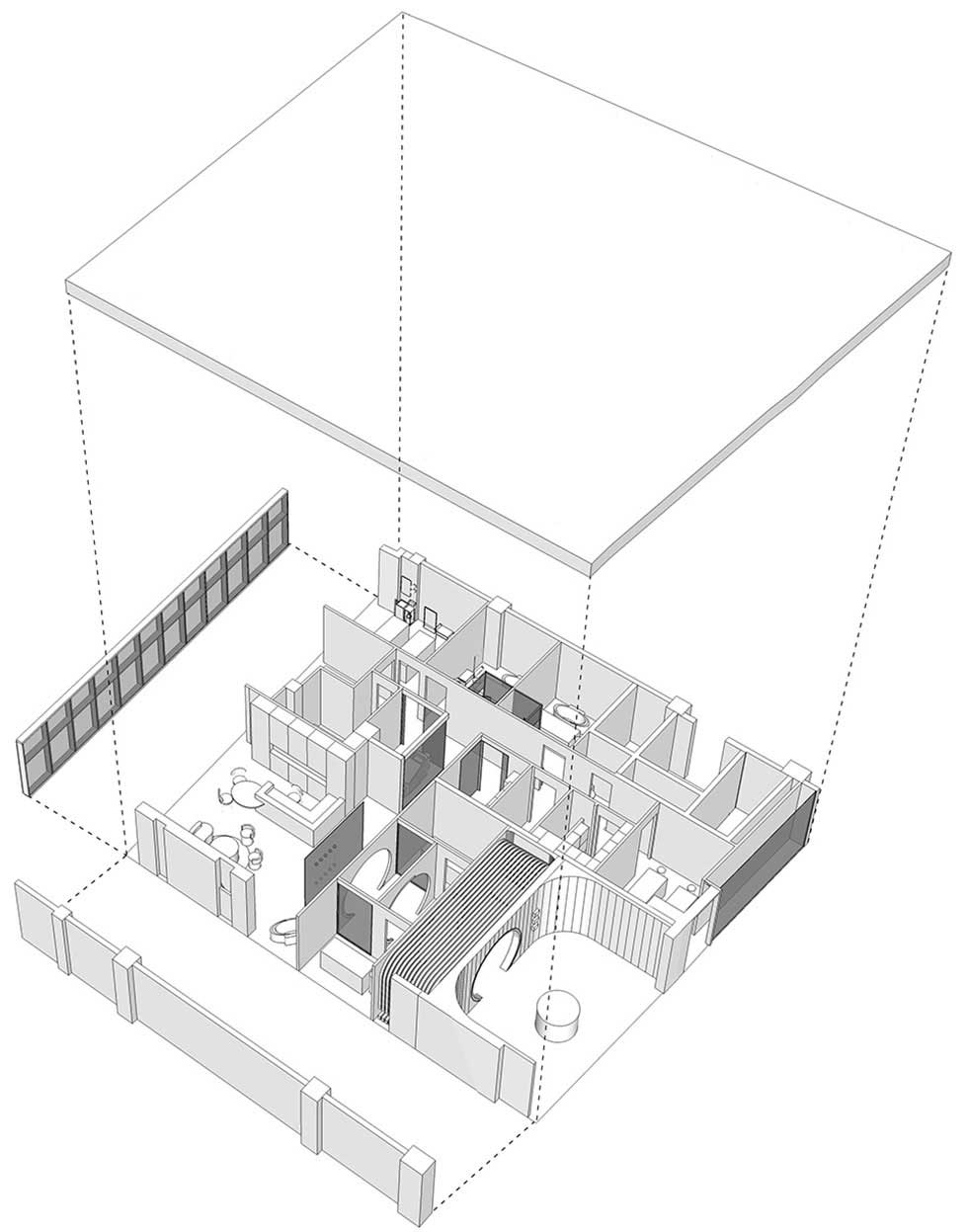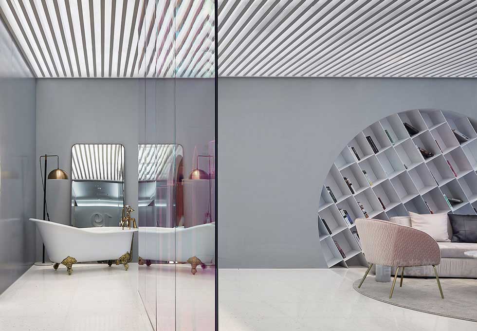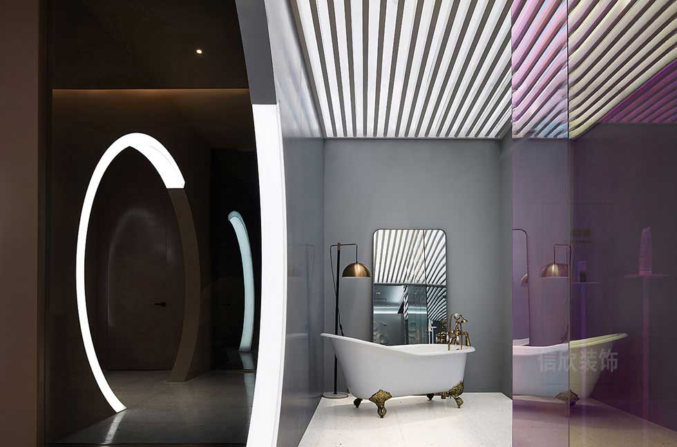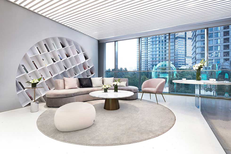 入口通過創造景深將視覺導入到空間,入口產品展示大廳,大面積白色與弧形門洞相疊加,穿梭進入旋轉光圈的弧形門洞,仿佛物質經過時間和空間的流轉而產生內在變化,猶如置身于一條通往美與蛻變的“時光隧道”, 留給人無限的想象與神秘感。空間以近乎純白色調擴容視覺,通過光影、材料、線條的相互關聯,體現多樣變化,同時將優雅和專業的雙重屬性賦予LE CYGNE。