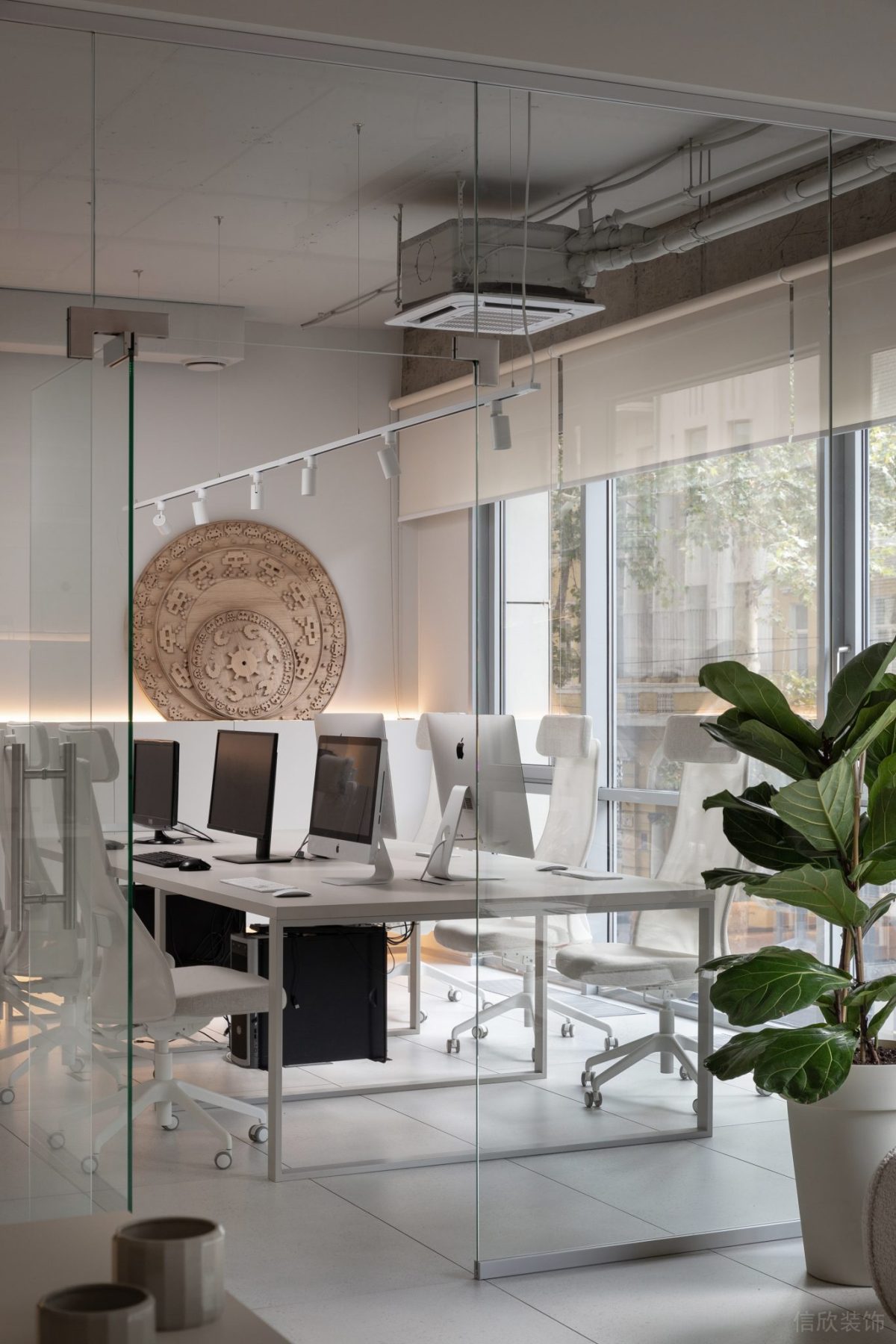 空間北部則是簡潔的辦公區和會客茶室,功能化的設備,隱藏繁瑣的線條,設備掛件,讓整潔的辦公環境給人清晰的邏輯和輕松的氛圍。部分的暖色配置,削減黑白的冷硬,提點人內心的溫度。空間中的每一樣器物都來自于設計者的精心挑選,設計的美體現在物的形態與功能之中,生活中的器物,傳遞著人對生活的熱愛,所以它們歸屬于這個空間,又不僅僅只屬于這個空間;他們在歸屬于生活,又不僅僅只用于生活……站在藝術的角度,器物不只是器物,裝修設計也不只是設計。