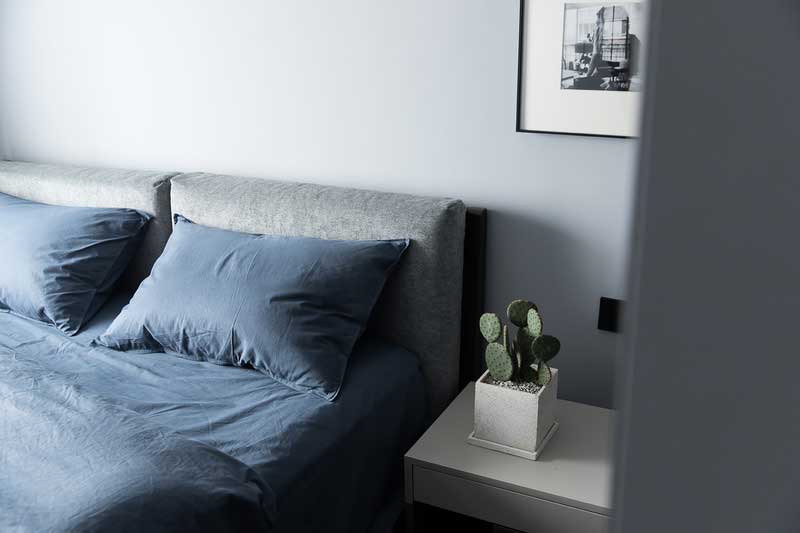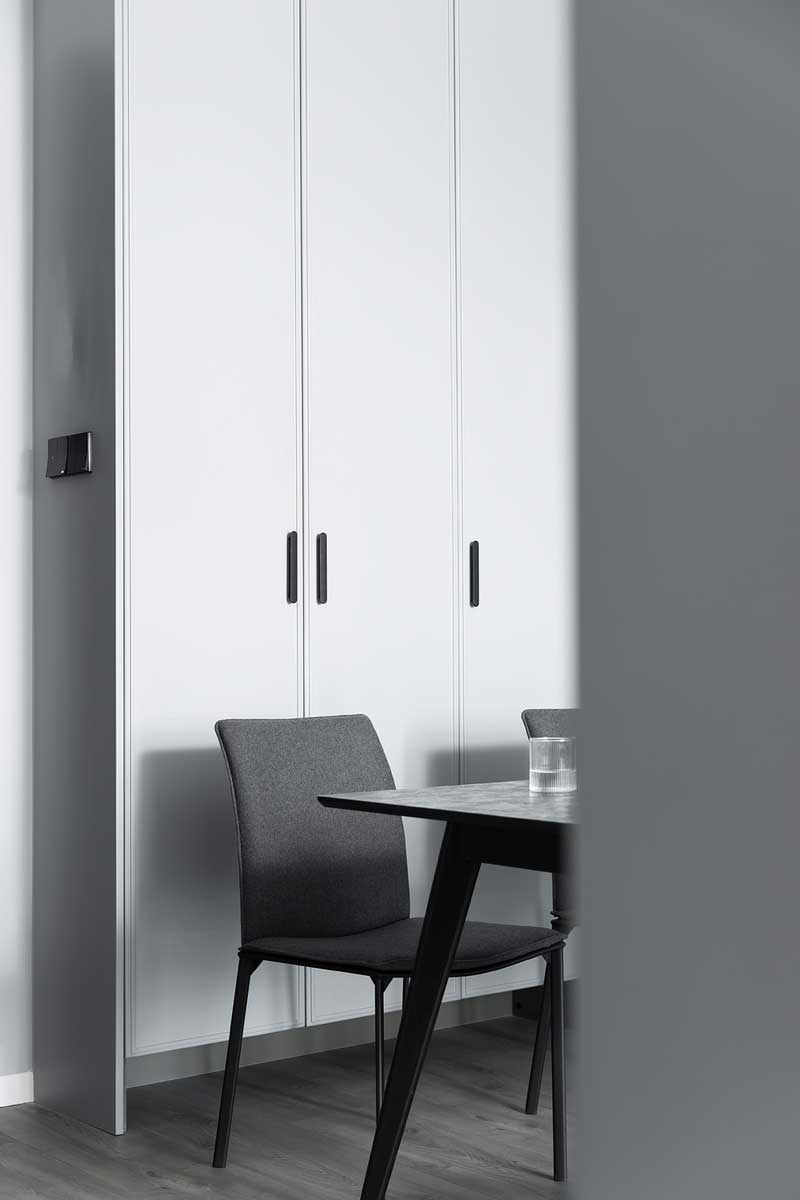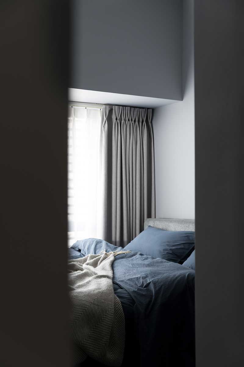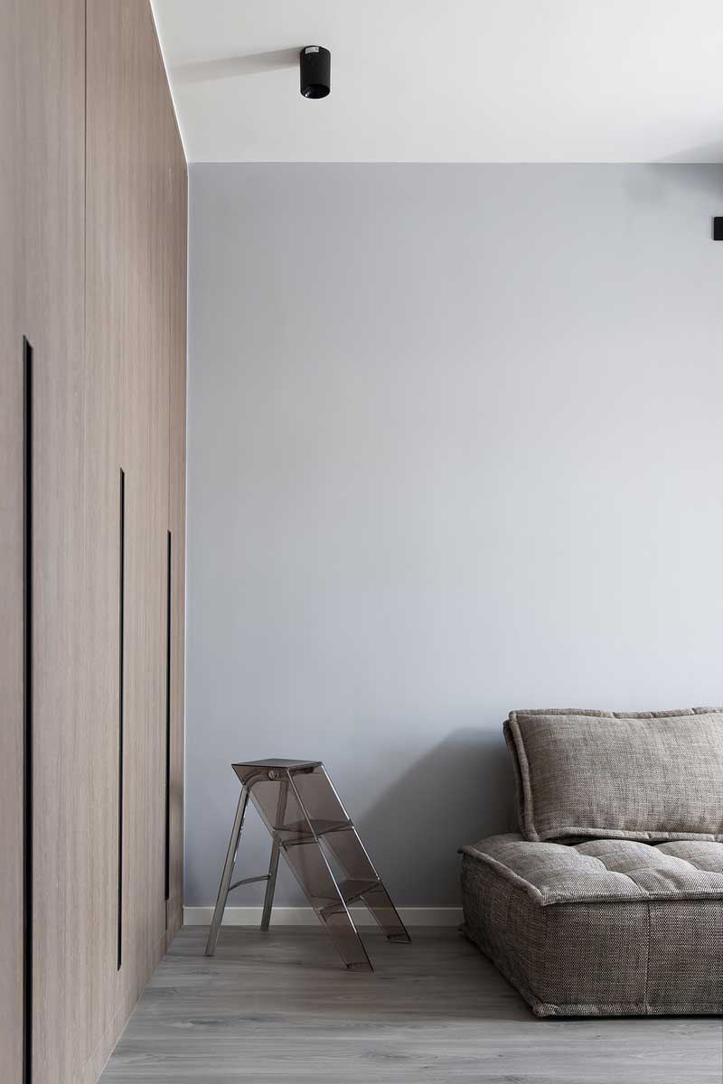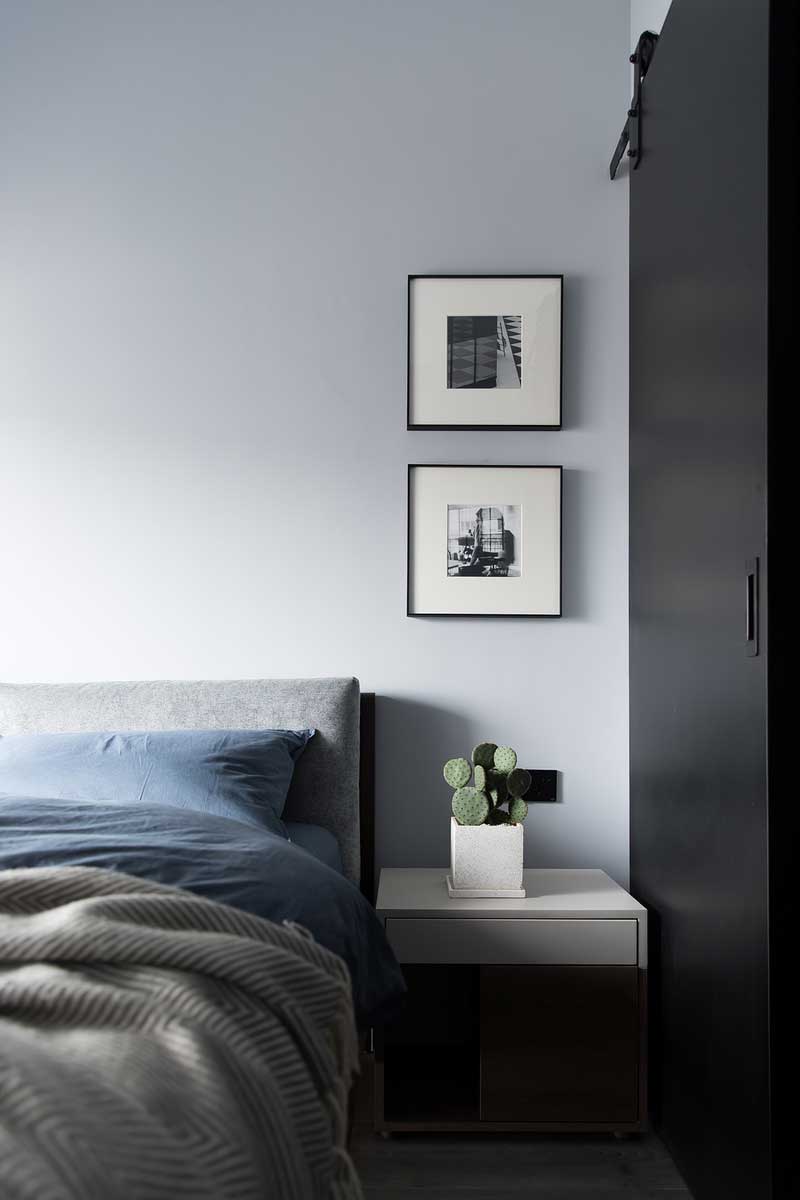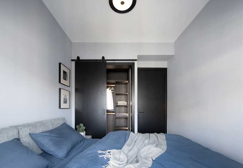 主臥設計依然強調簡單,直接的實用性,沒有設計吊頂和主燈,灰藍色的墻面,深色胡桃木的嵌入式衣柜,吊軌式的設計,給人一種簡單但充滿現代感的設計理念。