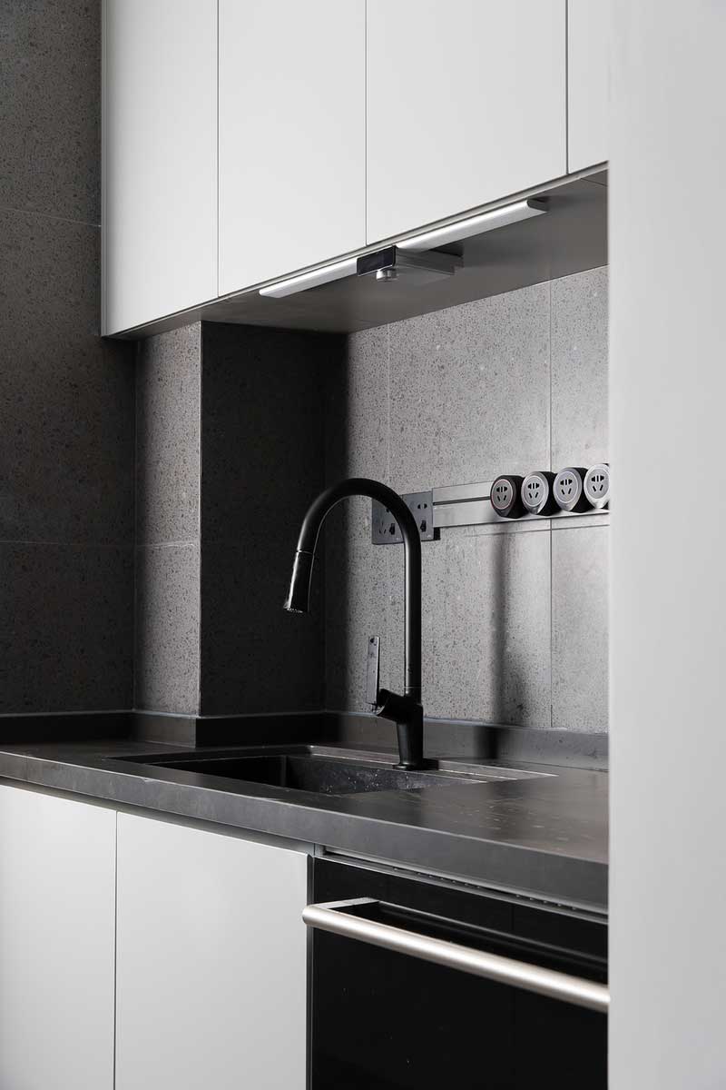 廚房采取兩邊直通式樣的吊柜和地柜的設計方式,把烹飪區和洗菜區做了一個完美的分隔,更增加智能家居洗碗柜等元素,使用起來功能性強,且操作的面積更寬敞。