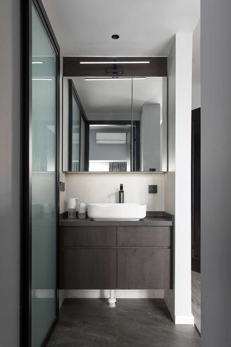干濕分離的衛生間,馬桶和玻璃隔斷的淋浴器在內部,懸掛式壁柜放在外間的處理,不僅方便打理,不留衛生死角,平時洗手也不需要進去衛生間,功能性更強。