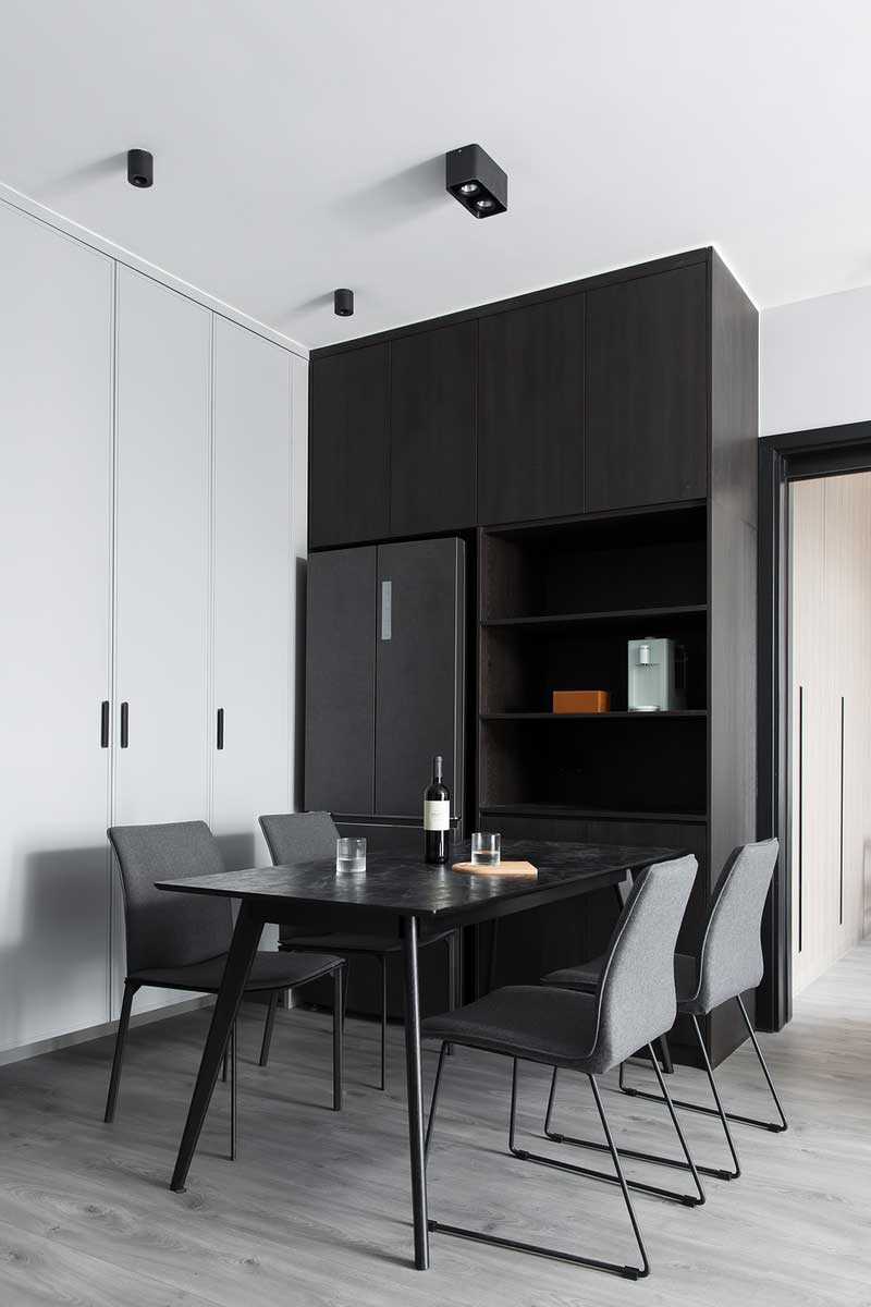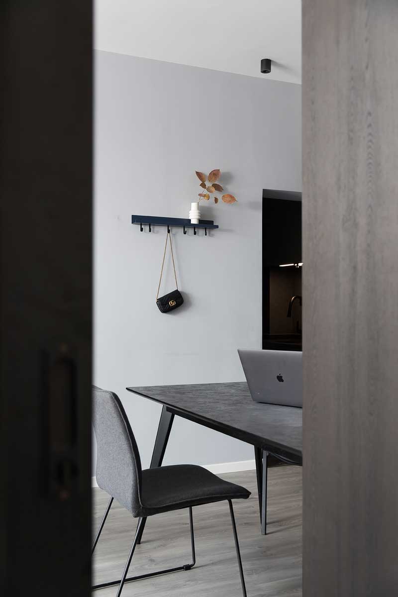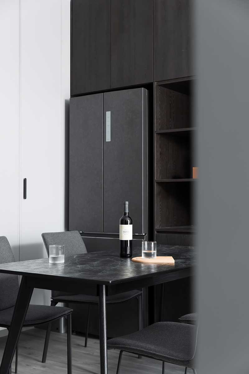 入戶位置,以淺藍色和黑色胡桃木的地板為主題基調,這樣處理溫馨而時尚,為了空間功能性最大化,餐桌和冰箱柜一體式的設計,既不會站空間,使用起來更方便。