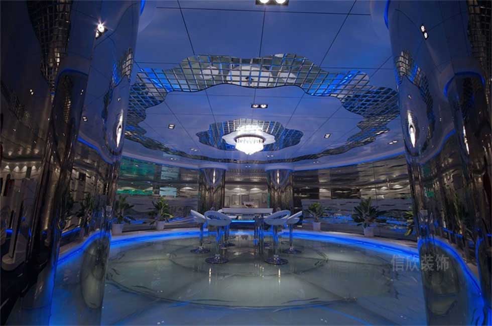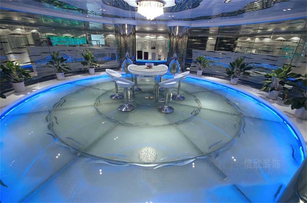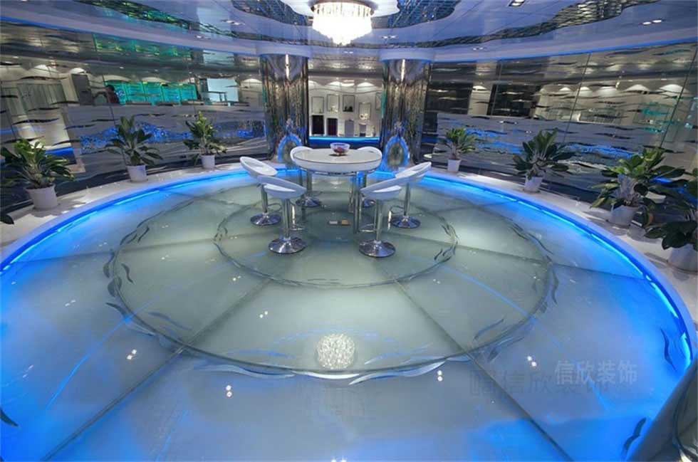 圓形的玻璃房間展區,玻璃的地面在燈光的作用下,泛起微微的藍色光澤,圓形密封的玻璃外墻,水晶燈主吊燈照射在頂面上,白色圓形的小洽談桌,大圓套小圓的立體設計模式,前衛現代而且給人一種身處于科幻世界中的體驗美感。