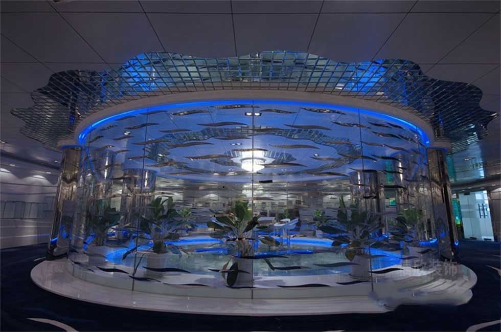 和圓形頂面對應的中心展示區,既有凸出重點,又能體現出區域分隔的妙處,半透明玻璃的材質,可以起到一定的隱私性,同時從外面看起則是一副似魚兒在游動夢幻般的場景。