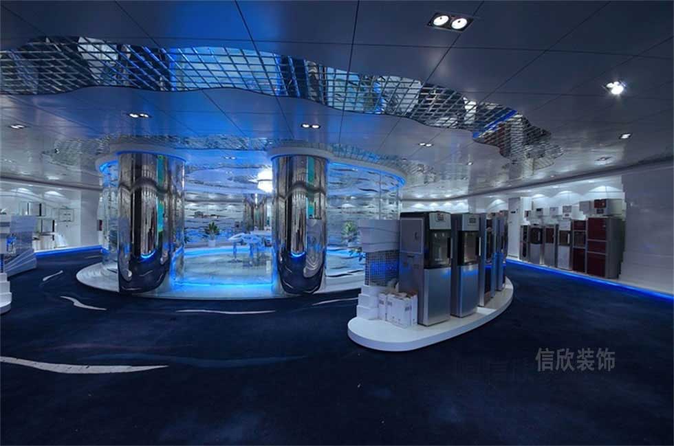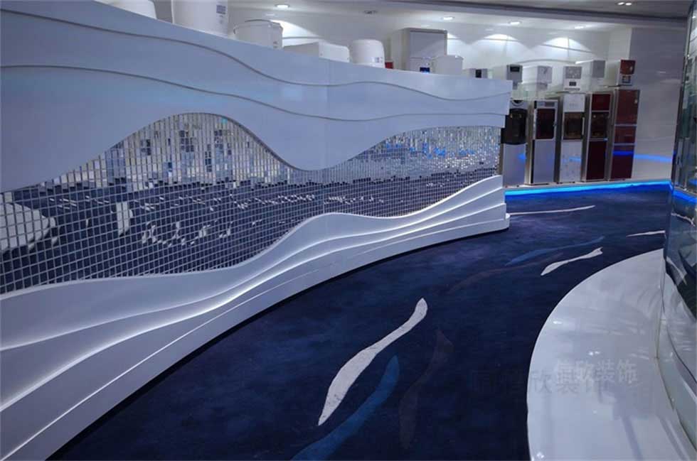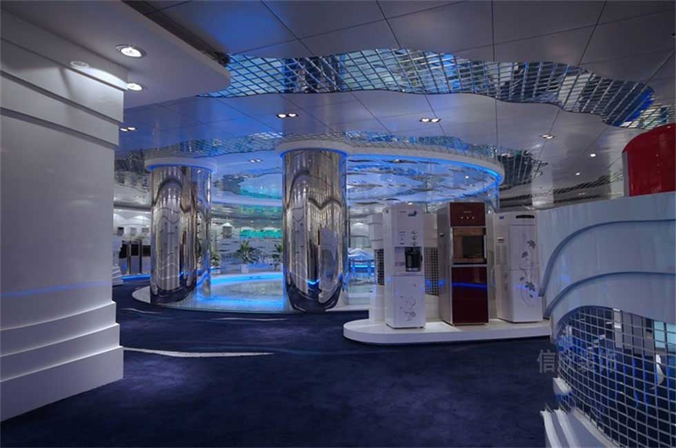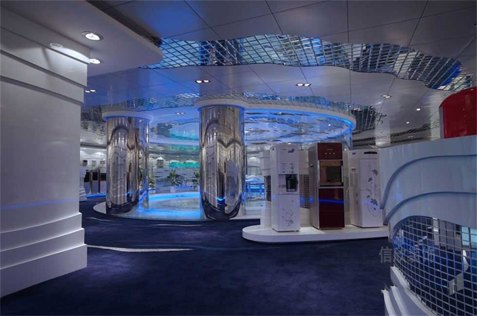 和整體對應的白色流線型的墻壁,以玻璃的展柜作不規則排列,提升其藝術感,在藍色地毯的搭配下,給人的感覺就好像海天一線般的,美妙場景,讓心在其中可自由的游弋。