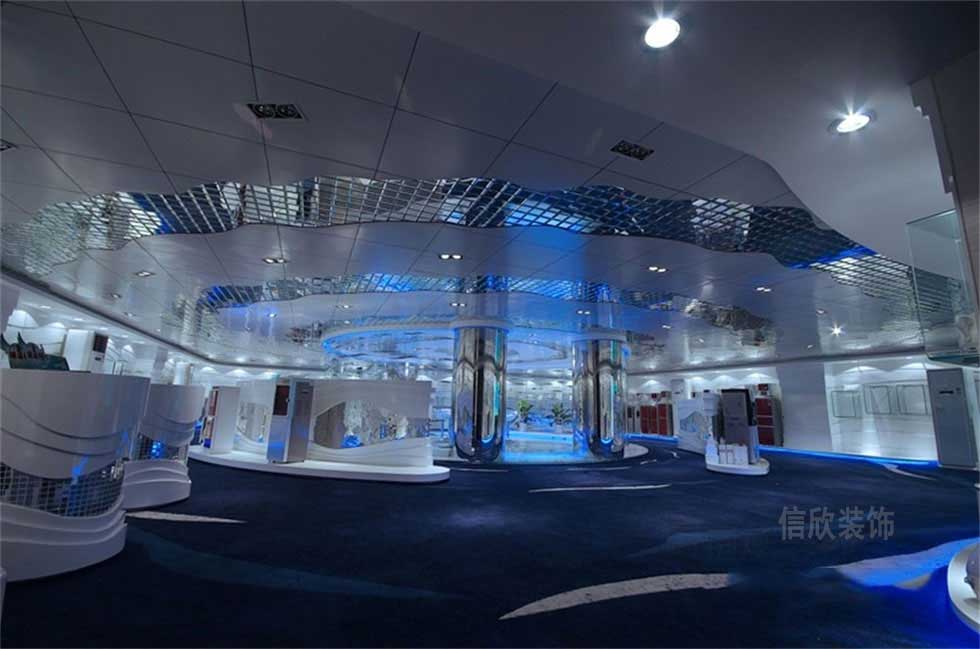 設計理念:本案是一所新新人類風格的企業產品展廳裝修設計案例,就名思議,它反映的是一種時尚,一種新興的產業。不拘一格,大量使用幾何圖案作為設計元素,明亮度對比強烈,大量使用新式裝修材料。適用于新興的電腦資訊業、媒體行業。在強烈的裝飾效果中,新產品和特征和公司創新科技的氛圍一覽無余。