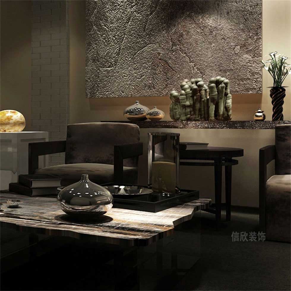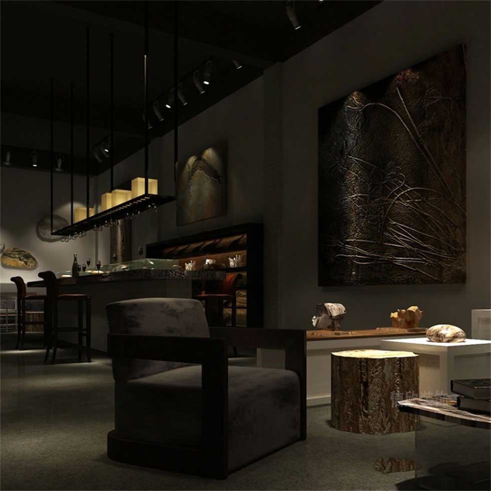 黑色的頂面全部做簡單的噴黑處理,墻面全部刷白,裝上亮度不算太高的射燈作為一個主光源,文化韻味濃厚的墻飾作為簡單的點綴,粗獷中更能體驗原始和天然的寓意。