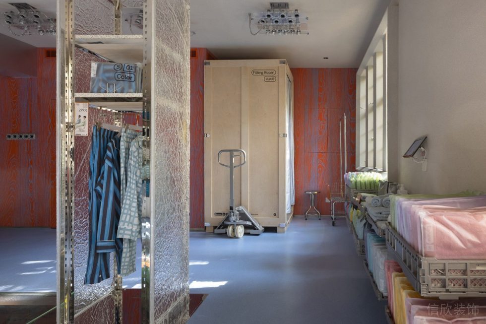 設(shè)計(jì)理念:本案是一所現(xiàn)代風(fēng)的小眾睡衣襪子服裝店,位于老城區(qū)的街道邊上,客戶需要設(shè)計(jì)上具有時(shí)尚和潮流的前衛(wèi)感,信欣裝飾公司的設(shè)計(jì)團(tuán)隊(duì)根據(jù)客戶的要求,以現(xiàn)代風(fēng)格入手通過(guò)別出心裁的設(shè)計(jì)和獨(dú)有元素,打造出小眾亮眼的設(shè)計(jì)感。入戶采用黑色的門(mén)頭,結(jié)合白色的拼接式LOGO,黑白的色彩搭配,結(jié)合幾何的圖形看上去醒目大氣,通明玻璃門(mén)的設(shè)置,讓店內(nèi)更明亮更飽滿。頂面則更有石膏板和中間實(shí)木的板材豎式的格柵結(jié)合,再加上六根金屬鏤空式的鐵藝架子支撐,銀色的褶皺感的塑料布包邊,既可以當(dāng)做展架展示貨品,也是一種創(chuàng)意感十足的設(shè)計(jì)元素。店里白色乳膠漆的墻面,環(huán)保,省錢(qián)讓光線亮度更好,灰色和藍(lán)色的地漆,讓地面顯得更有色彩的對(duì)比性。黃色亞克力玻璃的貨架,則增添了不同的元素,讓主題更充實(shí)。從而讓整個(gè)服裝店看起來(lái),更有現(xiàn)代元素,小眾時(shí)尚的氣息,更有自然獨(dú)特的品牌元素,讓顧客更容易記住這家創(chuàng)意十足的店。