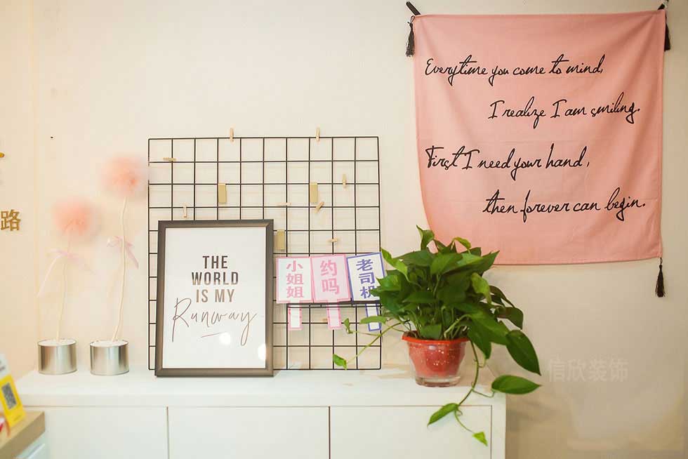 在設計上充分考慮商業空間的獨特性,美甲店消費群體主要為追求時尚與美麗的女生。空間則以店鋪logo金色為主色,粉紅色飾物作為點綴,粉紅的火烈鳥、粉紅的抱枕和掛旗……都能為顧客帶來美的享受。