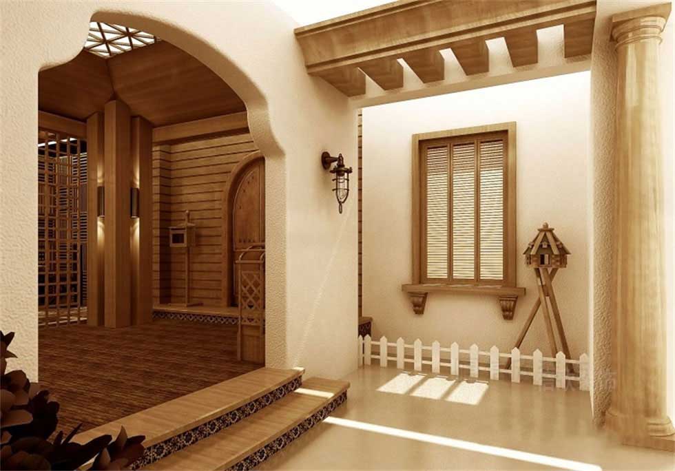 展廳入門的設計理念,以淺黃色的單色調為主,為了凸顯原木風展廳的自然感,用顏色相近的表現形式,加入歐式羅馬柱,拱形門等元素,襯托出大氣和自然的感覺。