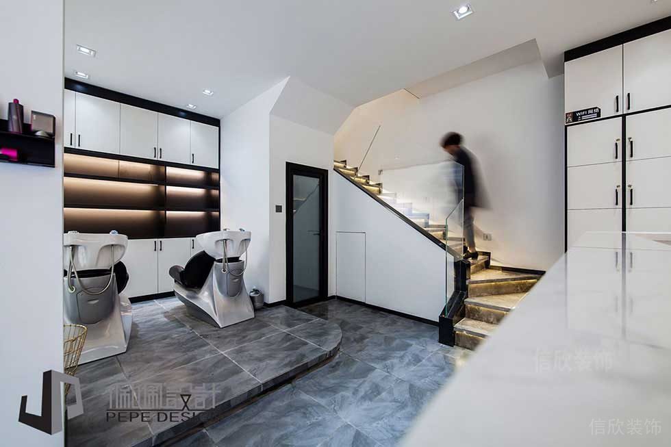 設計已然把人體工程學,空間動向,家具,燈光合理分配,整合,單獨隔出的小空間作為洗頭區域,使其功能性更強,也具備一定的隱私性。