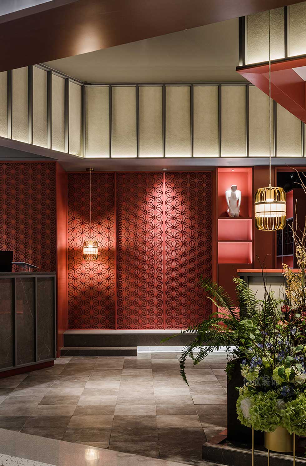 在日本的建筑語(yǔ)匯中,小而獨(dú)立的空間規(guī)劃滿足了其多樣性的功能需求,鑒于此,設(shè)計(jì)師在空間布局上,合理劃分出多個(gè)小而通透的“小房間”。走在商場(chǎng)過(guò)道,前臺(tái)、水吧、等候區(qū)以及剪發(fā)區(qū)以最優(yōu)美的形式展現(xiàn)給過(guò)客,制造生動(dòng)而強(qiáng)烈的情景互動(dòng)。木格柵一定程度上體現(xiàn)著日本的審美方式,作為統(tǒng)一的裝飾符號(hào)靈活貫穿于整個(gè)立面。入口處紅色鋼板雕刻的櫻花圖案,以現(xiàn)代的裝飾手法營(yíng)造虛實(shí)相間的立體感。定制款雕塑,在燈光的照射下呈現(xiàn)靜穆的美。