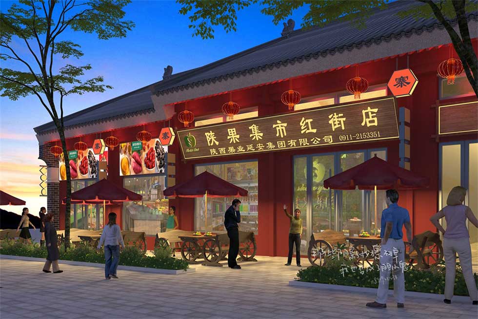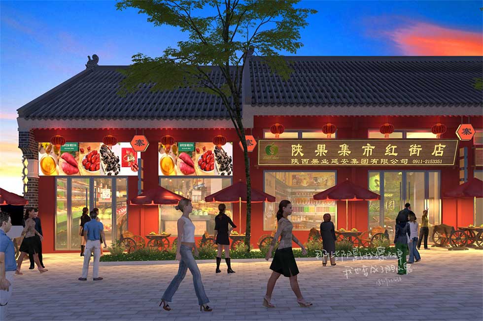 水果店門頭的設(shè)計(jì),秉承古典中式傳統(tǒng)設(shè)計(jì),秦磚漢瓦的元素,青灰色的磚瓦和三角形的建筑結(jié)構(gòu),古色古香,回味悠長(zhǎng),紅木的門框,紅色的燈籠,則取一個(gè)非常好的開門紅寓意。