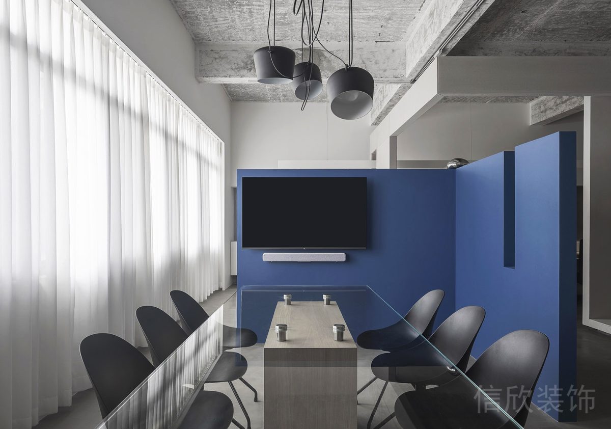 二樓會議室裝修也采用純白色設計,頂面黑色軌道燈點綴空間。