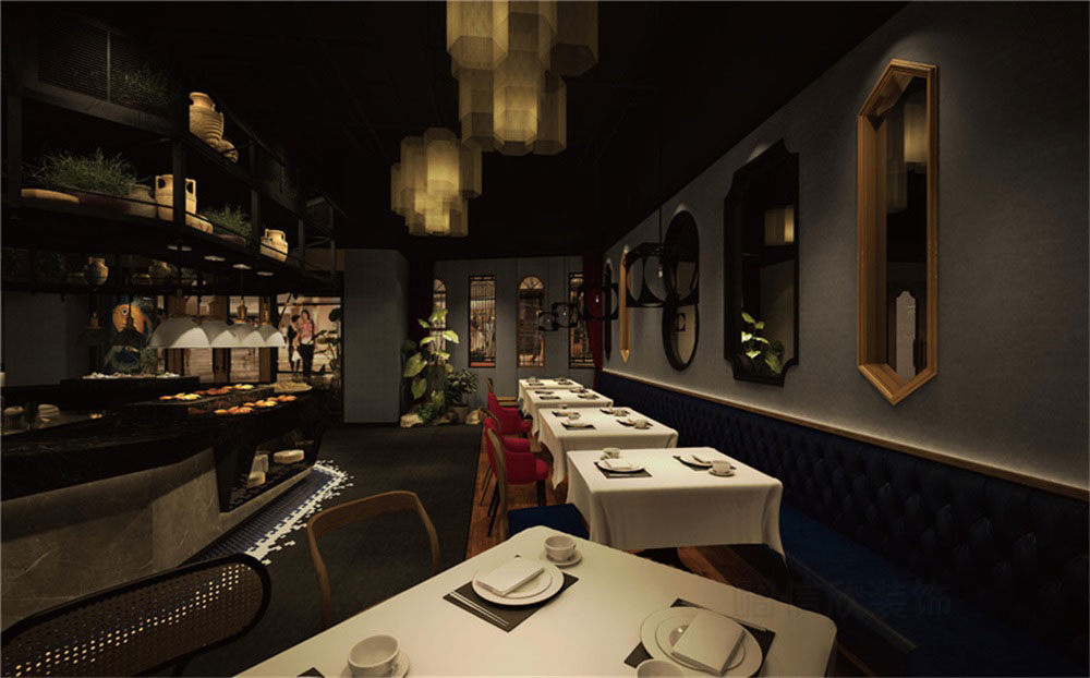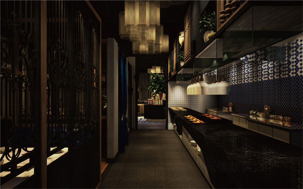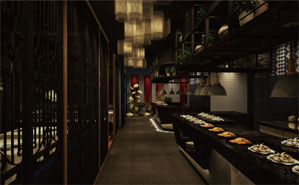 本案以海洋元素為設(shè)計主線,將波浪、魚鱗以及航海主題的各種軟飾貫穿于整個空間,打造出豐富、俊朗、明快且主題明確的自助就餐環(huán)境。