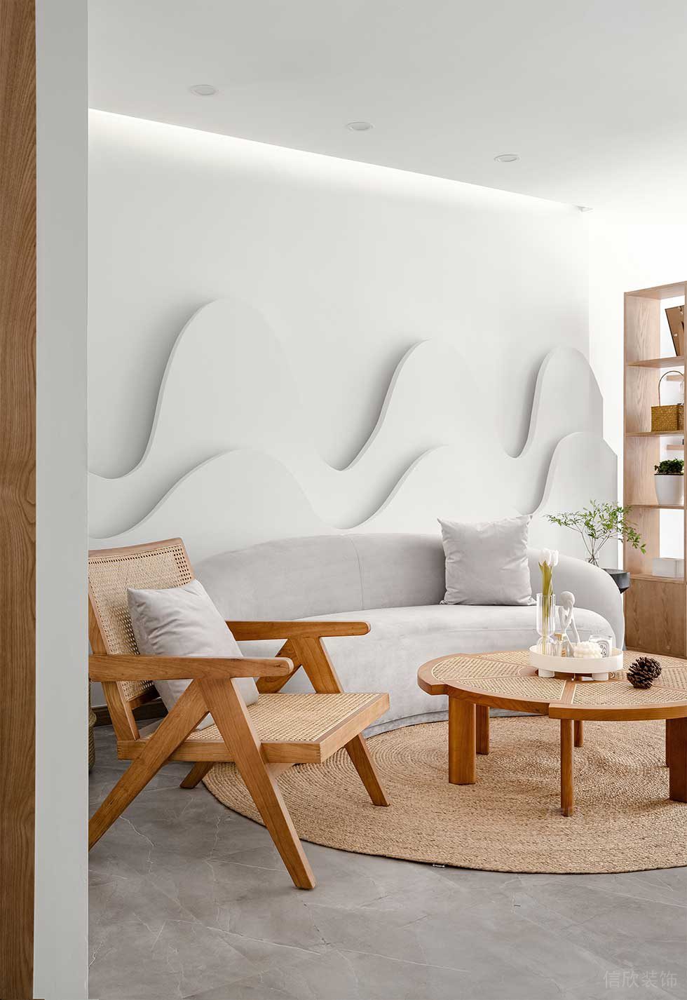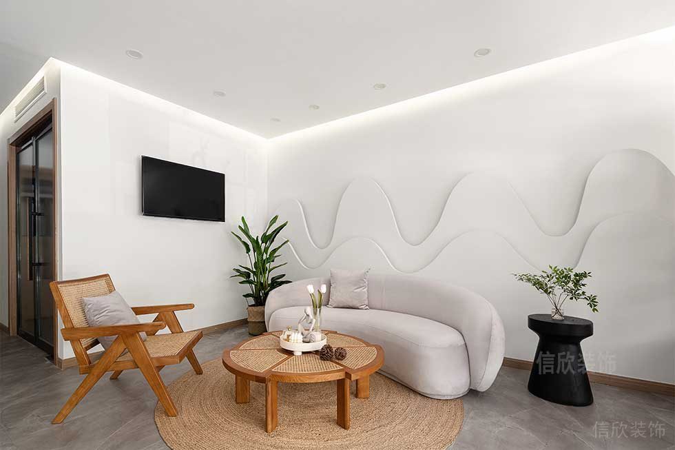 整體白色的效果,外擴式的燈條,帶動整個空間的氣息,看起來靈動活躍而不顯得呆板,白色石膏板的波浪紋背景墻,依山傍水的休閑方式,盡享精致生活的情調。