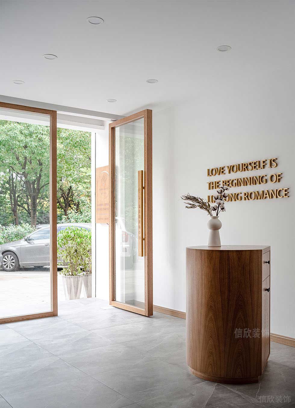 前臺的裝修設計,白色的墻面和灰色大理石紋理的地磚應用,落地式的玻璃門窗,整個空間光線飽和度高,明亮開闊,原木風紋理的前臺,體現出至簡,樸素的生活方式。