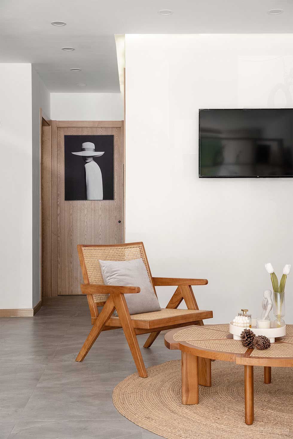 原建筑結構做一個簡單的刮白處理,搭配原木風的木地板,開發商落地窗的設計,用大面積光線引入當做設計的一部分,使空間看起來開闊透亮,而不會顯得擁擠狹小。