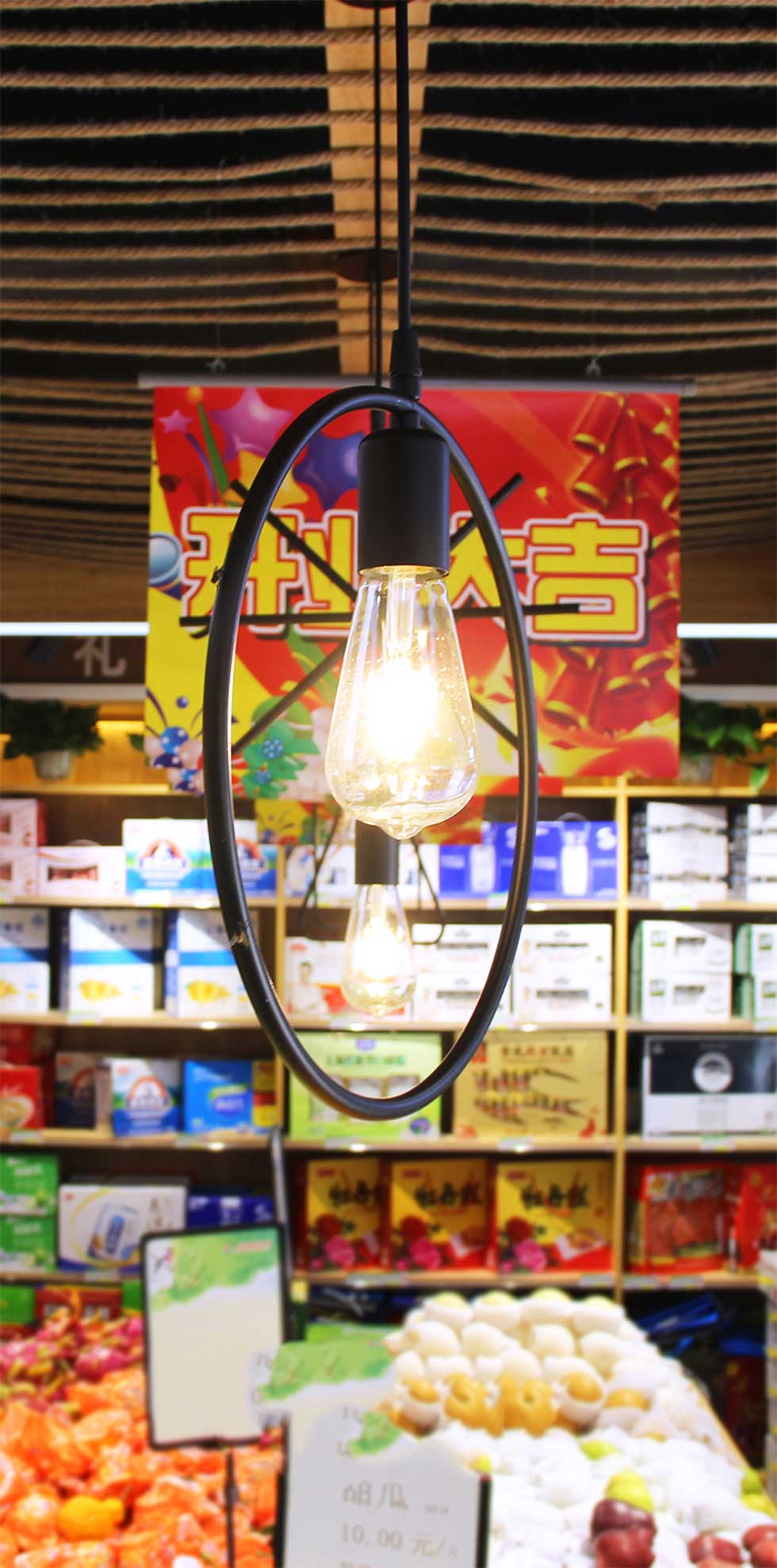 正方形的圓形燈眉讓中島臺的空間,設計感和線條感更強烈,里面大小不一的圓形設計,工業風的鐵藝吊燈,使光線的飽和度提高,光影折射充足,讓水果在中島臺上顯得更漂亮。