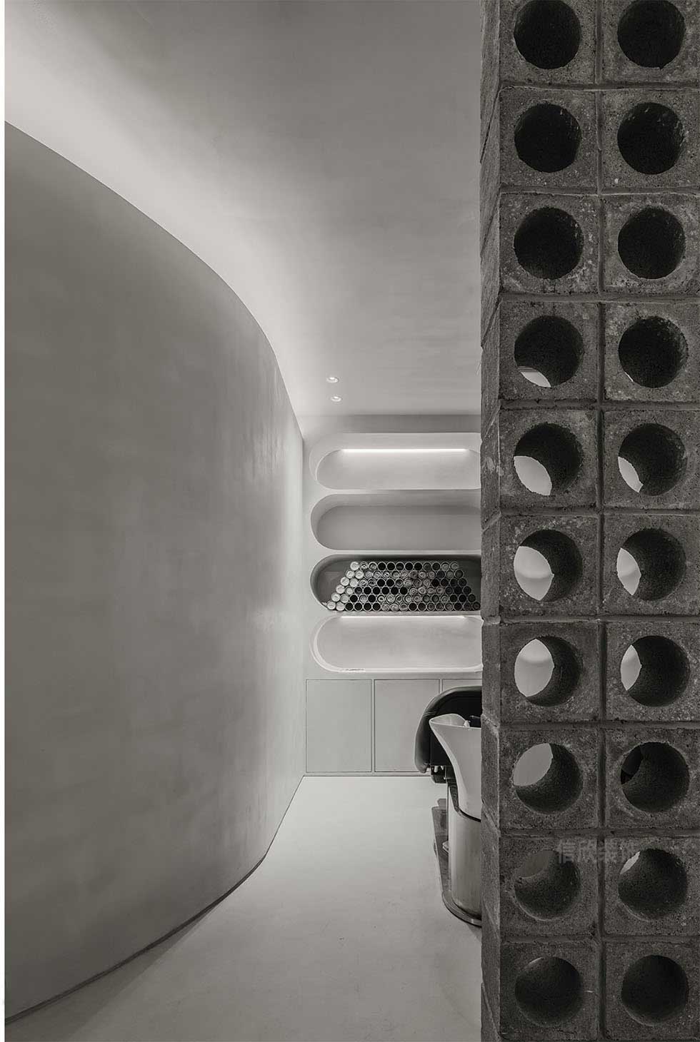 通過對“形”與“色”的對比、交疊、碰撞、拼接、組合,找到了微妙的平衡感,也賦予了空間無窮的可能性。設計將細膩的水流與光影變化納入其中,分隔精細的收納架讓美發、護發的產品有了便捷清晰的收納,同時裝點了空間。