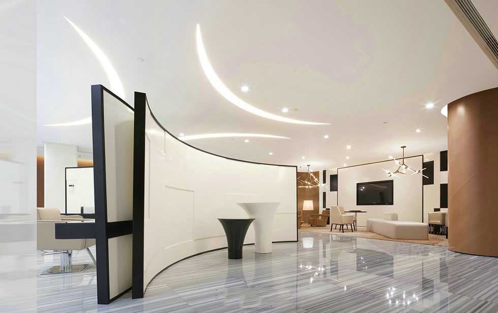 優雅的弧線形,充滿了靈動性,設計師將弧線有層次的融入到整個空間中,線形的黑白石材,摩登時尚,大幅的影像,引領時尚的前沿。